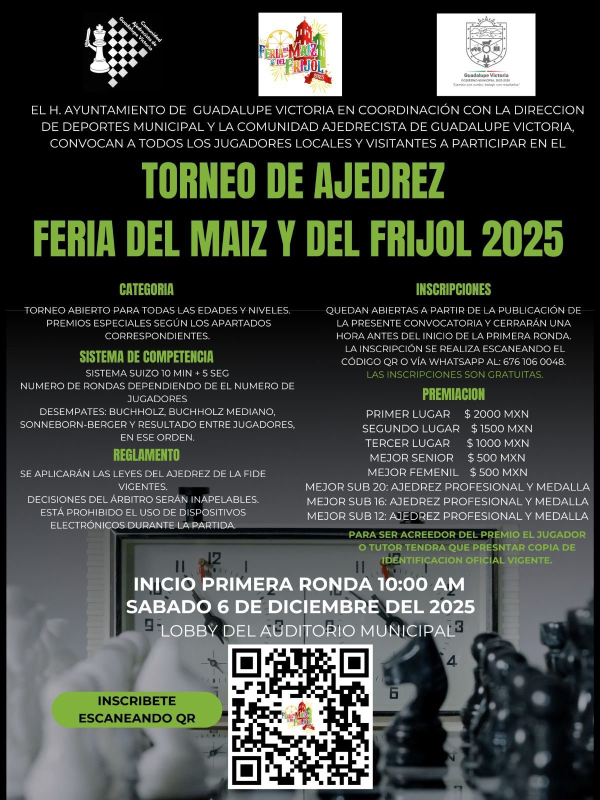 El H. Ayuntamiento de Guadalupe Victoria, en coordinación con la Dirección de Deportes Municipal y la comunidad ajedrecista, te invita a participar en el Torneo de Ajedrez – Feria del Maíz y del Frijol 2025.