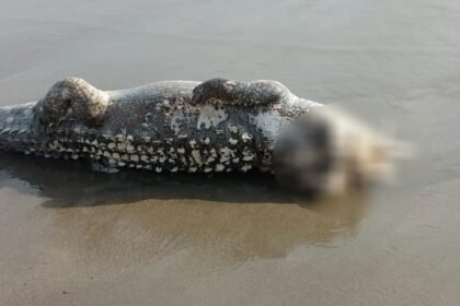 Encuentran el cuerpo de un cocodrilo decapitado en una playa de Vallarta.