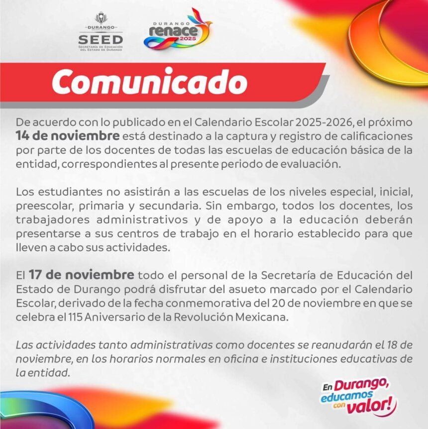 Por Martha Casas De acuerdo con el Calendario Escolar 2025-2026, el próximo 14 de noviembre estará destinado a la captura y registro de calificaciones por parte de los docentes de…