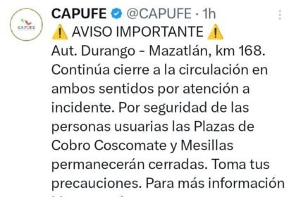 Por Martha Casas De nueva cuenta reportan cerrada la carretera Durango-Mazatlán, CAPUFE…