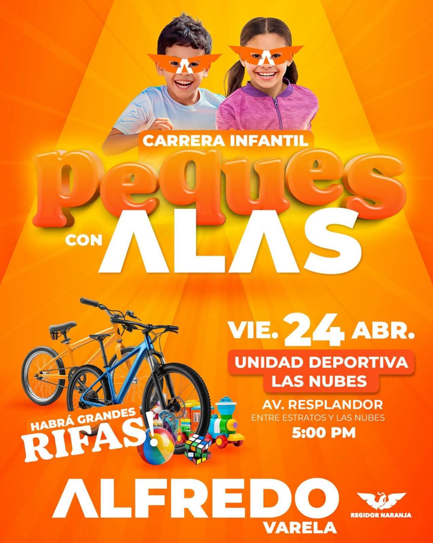 Con el objetivo de fomentar el deporte, la sana convivencia familiar y generar espacios de alegría para las niñas y niños duranguenses, el regidor de Movimiento Ciudadano, Alfredo Varela, llevará a cabo la segunda edición de la carrera infantil “Peques con Alas”. El evento se realizará el próximo viernes 24 de abril a partir de las 5:00 de la tarde, teniendo como punto de salida y meta la Unidad Deportiva Las Nubes, ubicada sobre Avenida Resplandor, entre Estratos y Las Nubes.