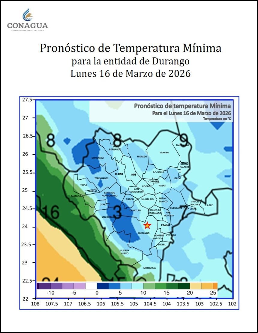 En las últimas 24 horas, en la ciudad de Durango se registró una temperatura mínima de 10.2 grados y una máxima de 33.3, además de rachas de viento cercanas a los 38 kilómetros por hora.