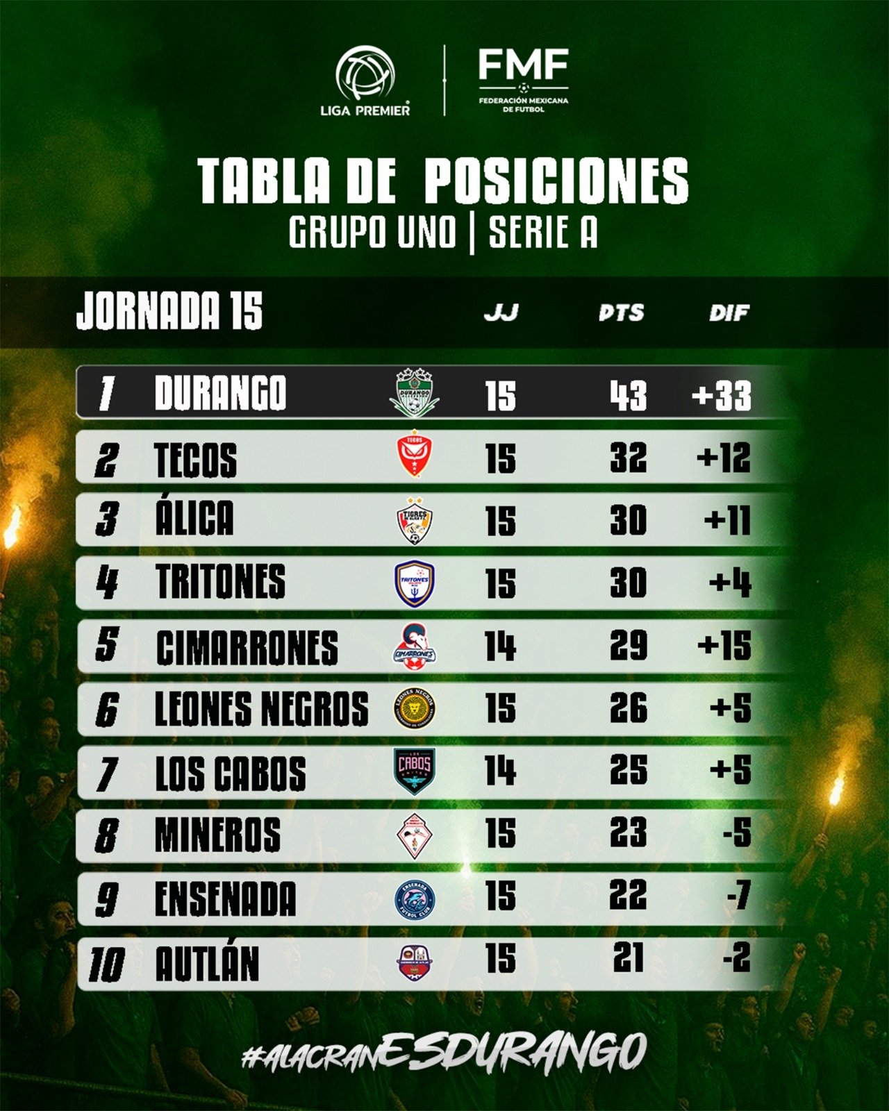 Con el respaldo de su afición y el momento futbolístico que atraviesa, Alacranes de Durango sigue avanzando con paso firme en la Liga Premier, decidido a sostener el liderato de grupo y a pelear palmo a palmo por la cima de la tabla general.