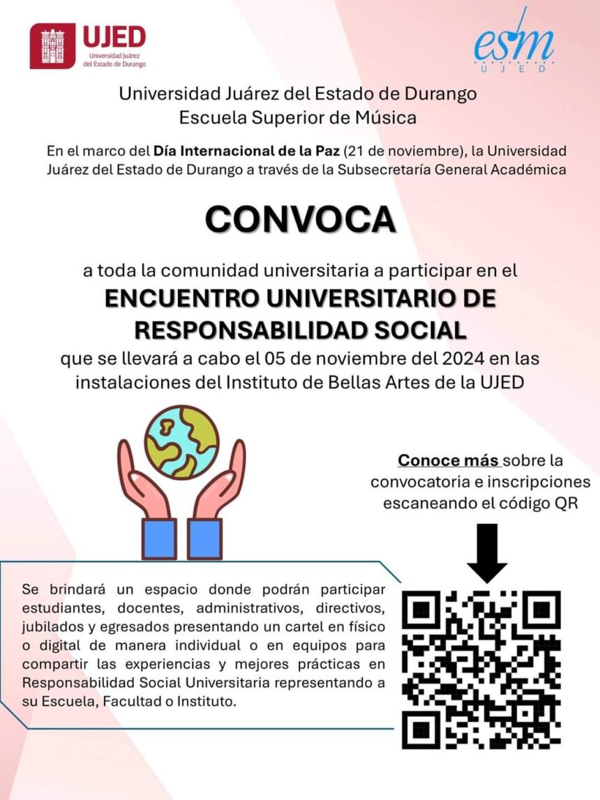El Día Internacional de la Paz, se conmemora el 21 de noviembre, la Subsecretaría General Académica de la UJED, convoca a la Comunidad Universitaria a ser parte del Encuentro Universitario de Responsabilidad Social que se llevará a cabo el 5 de noviembre del 2024 en las instalaciones del Instituto de Bellas Artes.
