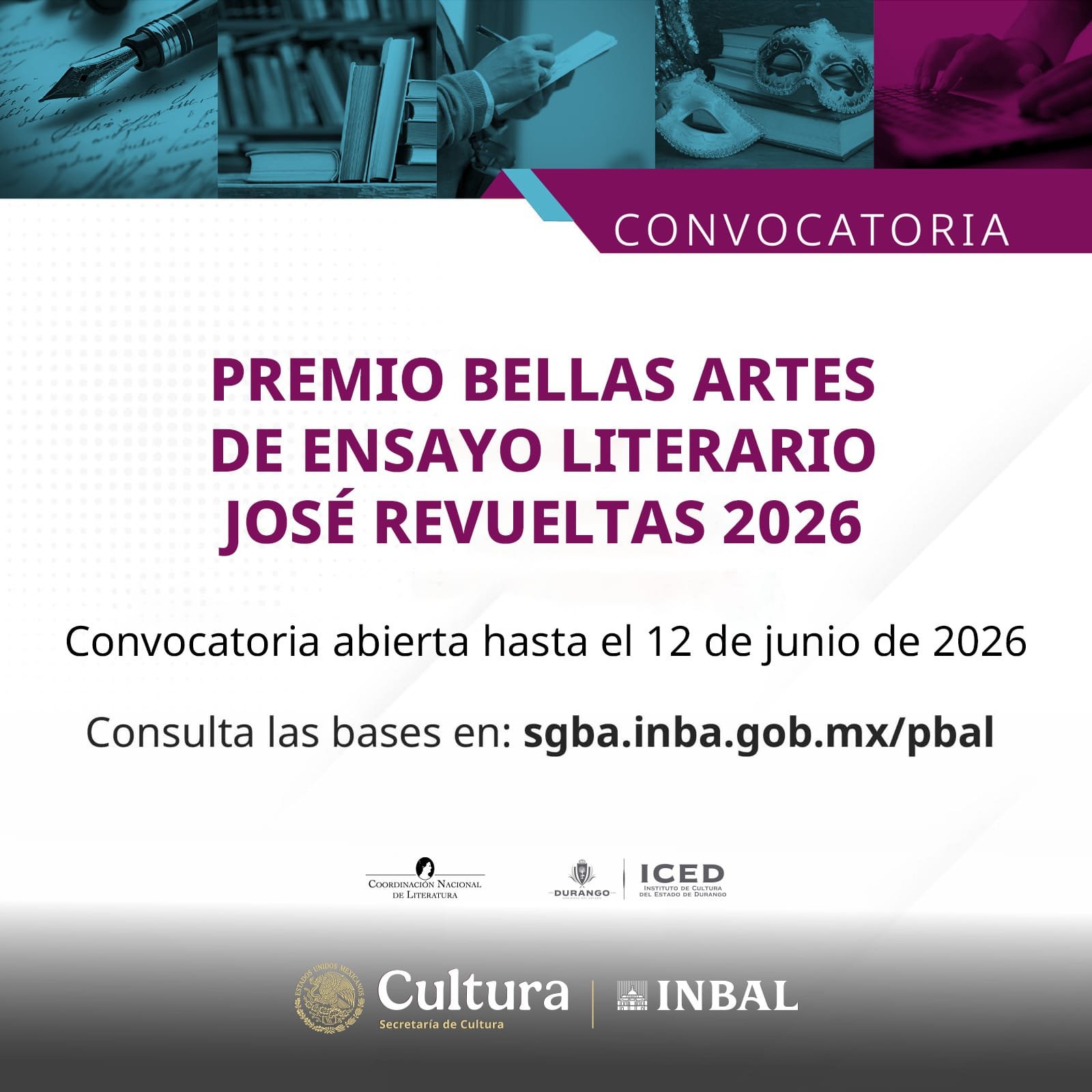 La Secretaría de Cultura del Gobierno de México, el Instituto Nacional de Bellas Artes y Literatura (INBAL) y el Gobierno del Estado de Durango, a través del Instituto de Cultura del Estado de Durango, convocan al Premio Bellas Artes de Ensayo Literario José Revueltas 2026. Este reconocimiento es uno de los más relevantes del país dedicados al ensayo literario y busca alentar la investigación y la creación en torno a la obra del escritor duranguense José Revueltas.