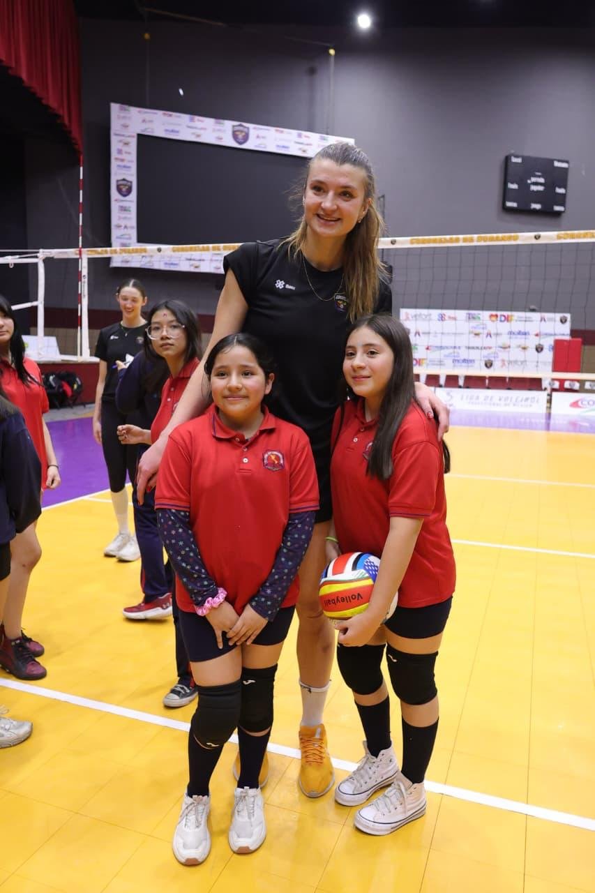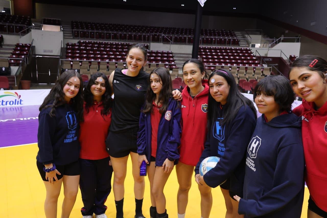 Durante una sesión de entrenamiento, los estudiantes tuvieron la oportunidad de estar muy cerca de las jugadoras, observar de primera mano su técnica, intensidad y trabajo en equipo, y absorber valiosos consejos directamente de las estrellas del voleibol duranguense.