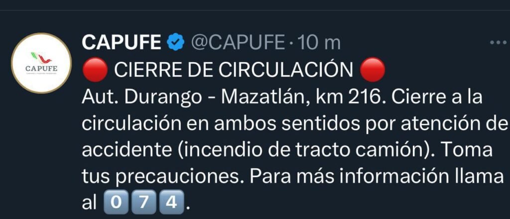 Desde su cuenta oficial, la CAPUFE publicó acerca del cierre en el kilómetro 216 por la quema de un tractocamión.