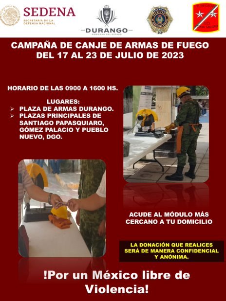 La Secretaría de la Defensa Nacional a través de la Décima Zona Militar la Secretaría de Seguridad Pública, en conjunto con el Gobierno del Estado de Durango arrancarán la campaña de Canje de Armas de Fuego correspondiente a este 2023; se llevará a cabo del 17 al 23 de julio.