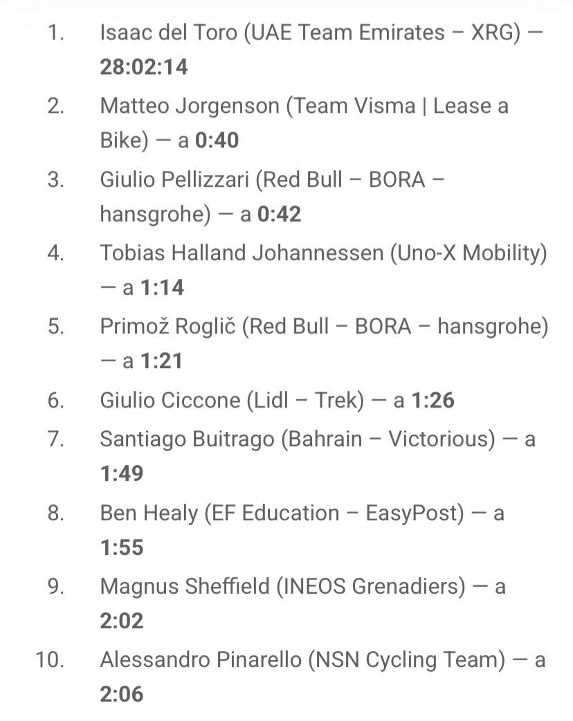 Sin embargo, el corredor del UAE Team Emirates – XRG logró mantenerse dentro del pelotón y aseguró el título con un tiempo acumulado de 28:02:14, superando por 40 segundos a Matteo Jorgenson y por 42 a Giulio Pellizzari, quienes completaron el podio de la clasificación general.