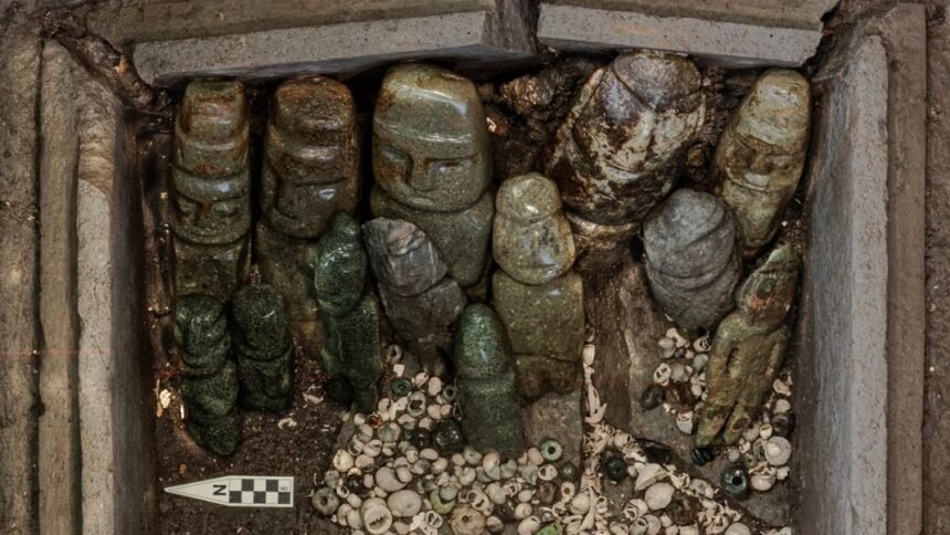 De acuerdo con sus descubridores, los arqueólogos Alejandra Aguirre Molina y Antonio Marín Calvo, estas esculturas, talladas en piedras metamórficas verdes —la más grande de las cuales mide 30 centímetros de alto, en contraste con la miniatura de escasos tres centímetros—, presentan rasgos esquemáticos característicos del estilo Mezcala de la sierra norte de Guerrero.