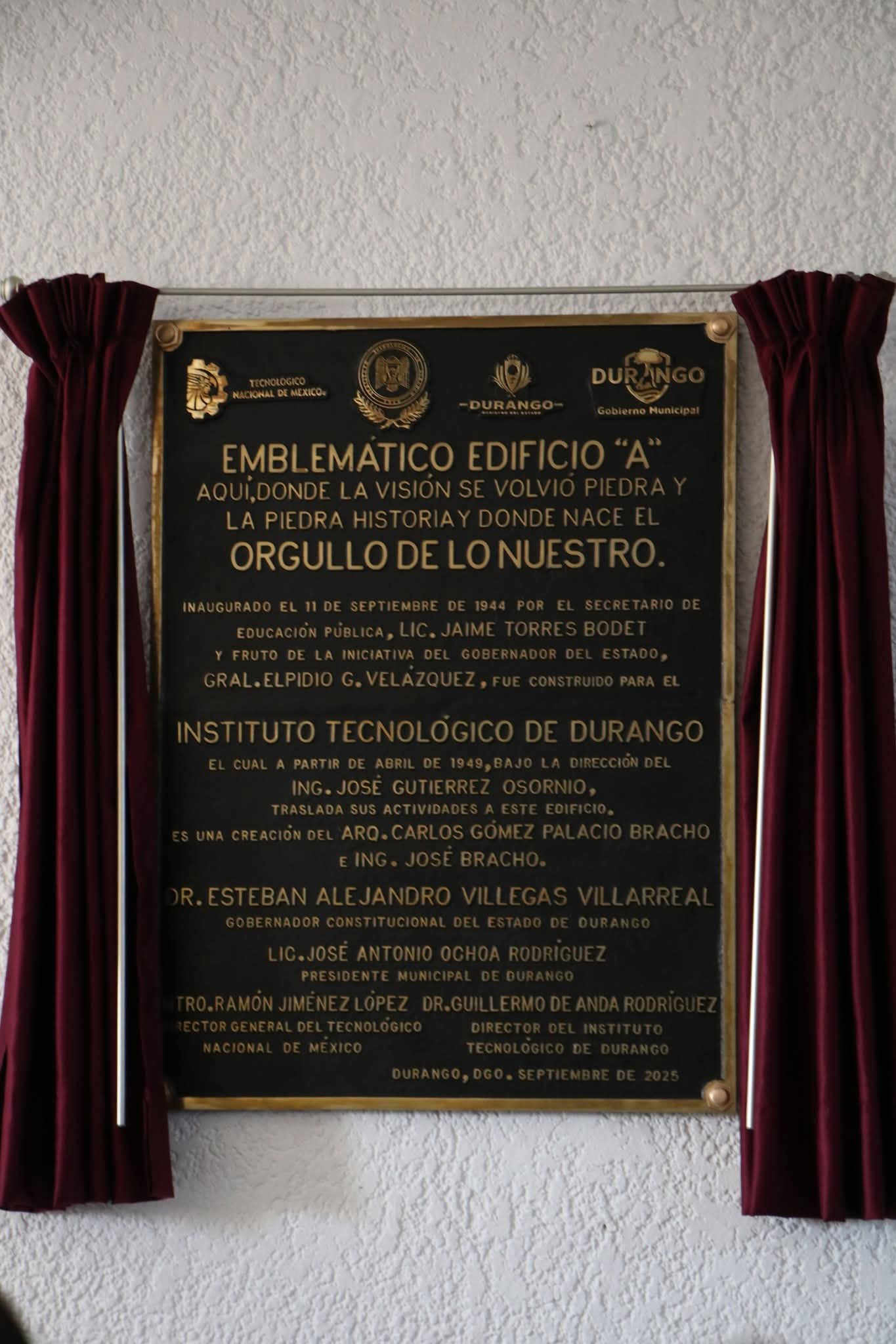 El Instituto Tecnológico de Durango celebró la develación de la placa conmemorativa del emblemático Edificio “A”, en cuál cumple 81 años de historia.Si inauguración se realizó el 11 de septiembre de 1944 por el entonces secretario de Educación Pública, Lic. Jaime Torres Bodet, como fruto de la iniciativa del Gobernador del Estado, Gral. Elpidio G. Velázquez; creada por el Arq. Carlos Gómez Palacio Bracho y el Ing. José Bracho, se convirtió con el paso del tiempo en un referente arquitectónico para la educación en Durango.