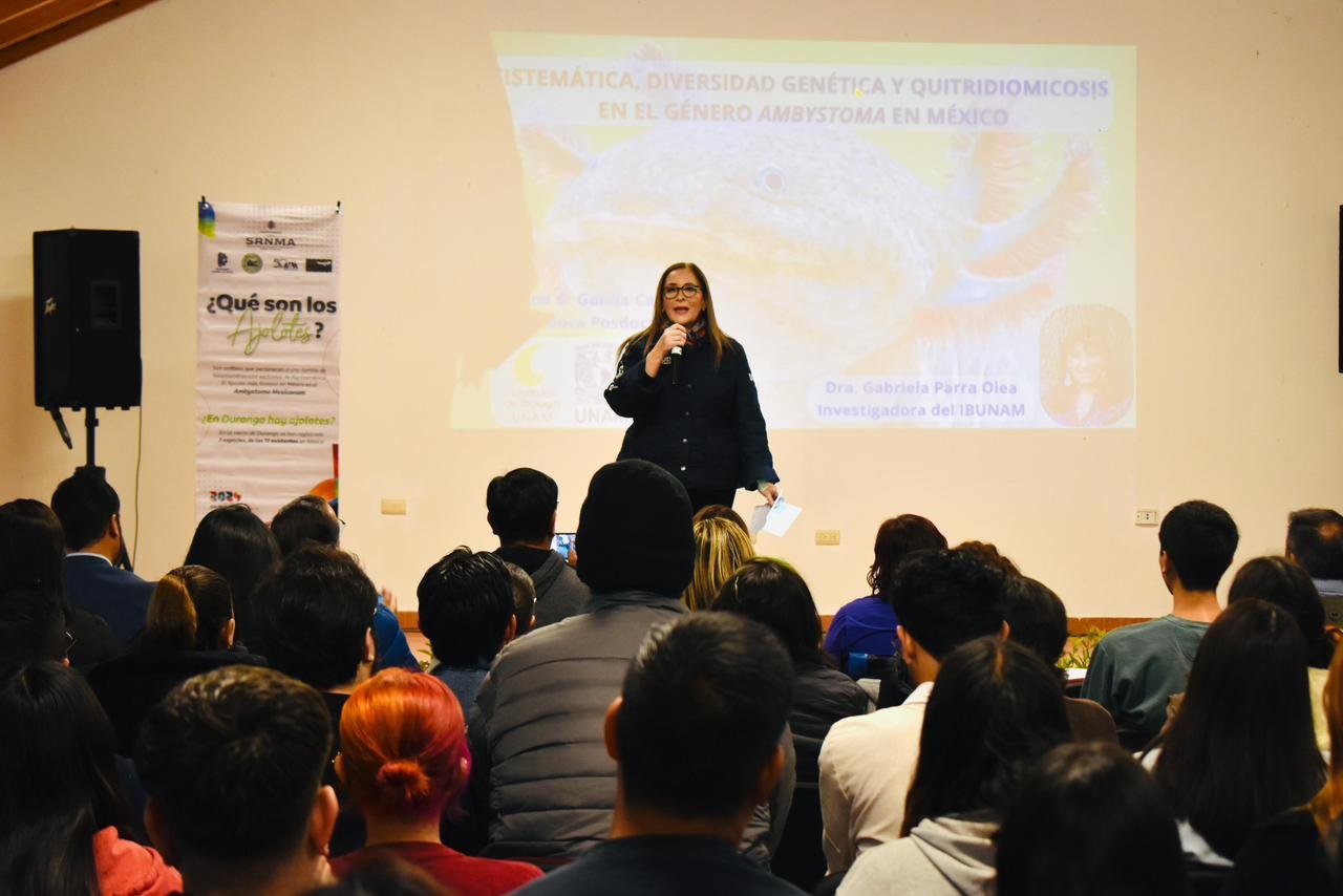 Como parte de esta jornada, se ofreció una conferencia abierta al público a cargo de la Dra. Mirna Grisel García Castillo, investigadora de la UNAM, quien explicó de forma accesible las características biológicas del ajolote, su ciclo de vida y la importancia que tiene como indicador de la salud de los ecosistemas acuáticos.