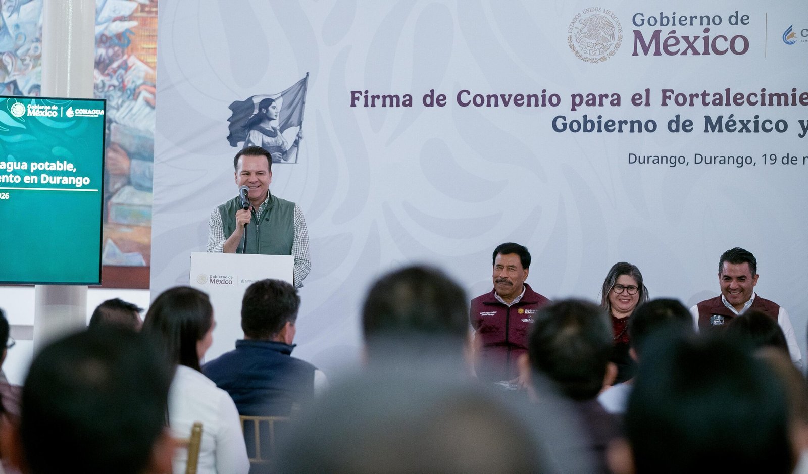 Tras la firma del convenio entre el Gobierno del Estado y la Comisión Nacional del Agua (Conagua), encabezado por el gobernador Esteban Villegas Villarreal, los 39 municipios avanzan en obras de agua y drenaje al destinar el 40 por ciento del Fondo de Aportaciones para la Infraestructura Social (FAIS), en un trabajo conjunto para llevar soluciones de fondo a las familias duranguenses en un tema clave como el acceso al agua, un derecho humano.
