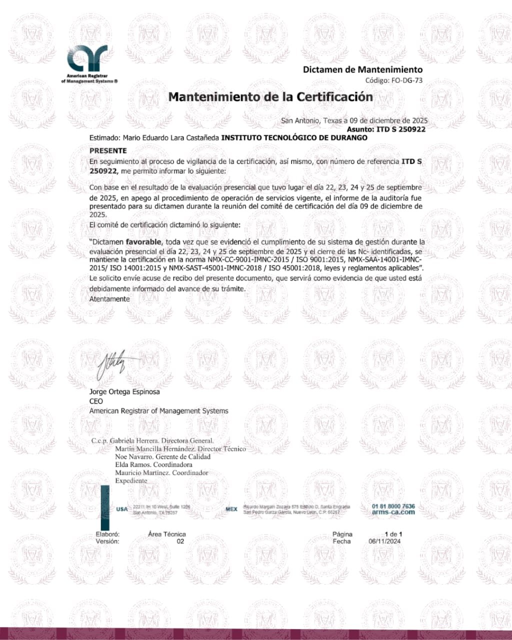 El Instituto Tecnológico de Durango recibió el dictamen favorable que confirma la vigencia de su Sistema de Gestión Integrado (SGI), tras la auditoría presencial llevada a cabo los días 22, 23, 24 y 25 de septiembre de 2025, esto como resultado del proceso de vigilancia realizado por American Registrar of Management Systems.