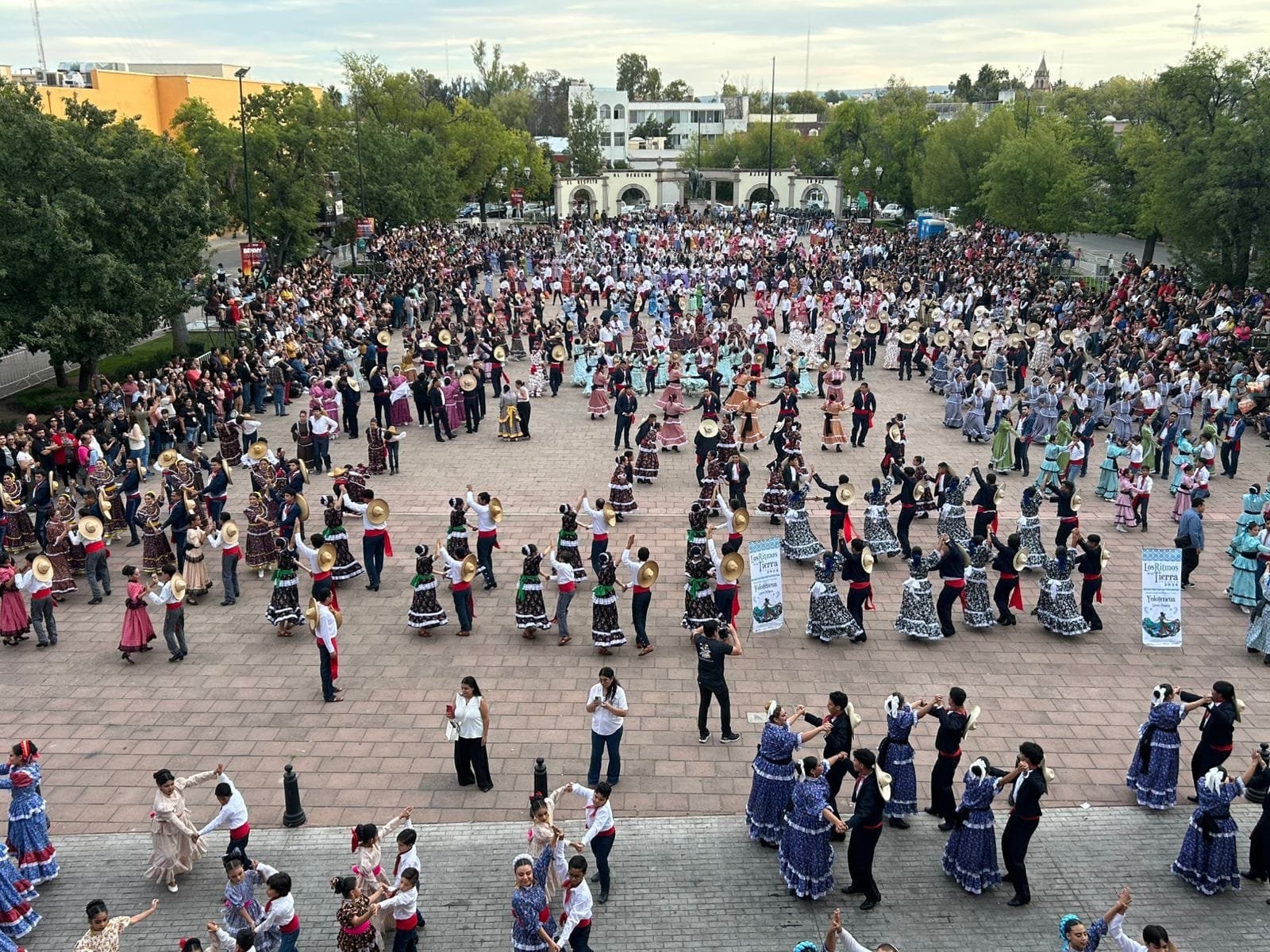 La Plaza IV Centenario fue el escenario de una gran celebración de identidad y folclor con la realización de “El Revolcadero Monumental 2025”, un evento que reunió a cientos de bailarines y músicos para compartir el orgullo de las tradiciones durangueñas. Con la participación de 69 agrupaciones folclóricas y 1,604 bailarines en escena, el evento alcanzó un récord histórico con 802 parejas bailando simultáneamente.