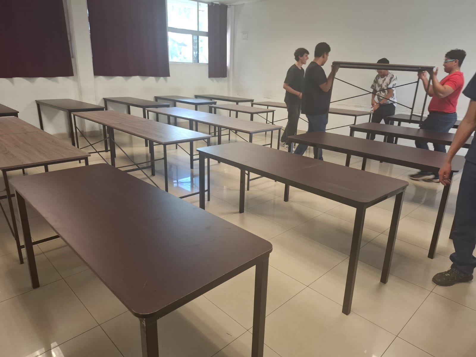 Además, alumnos y representantes de la carrera de Arquitectura, se integraron directamente a las labores de armado, distribución e instalación del mobiliario, participando activamente en la mejora de los espacios que forman parte de su vida diaria y fortaleciendo el sentido de pertenencia, la colaboración y el compromiso con su Instituto. Asimismo, se atendieron espacios de los edificios CCC, A y D, así como Servicios Escolares, logrando la instalación y armado de un total de 380 sillas y 140 mesas.