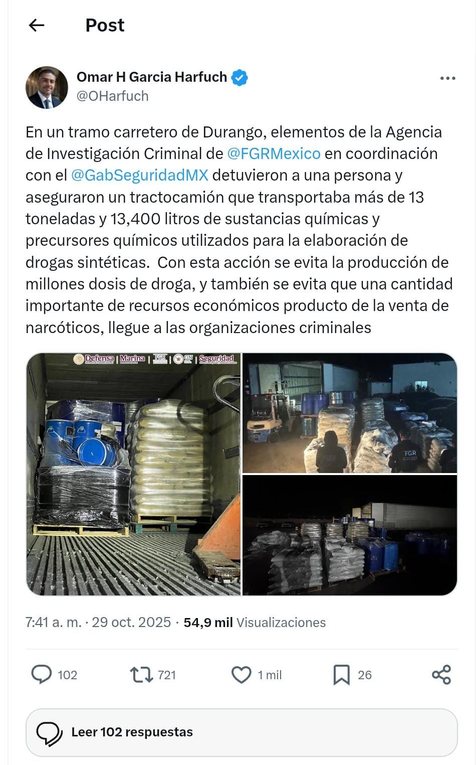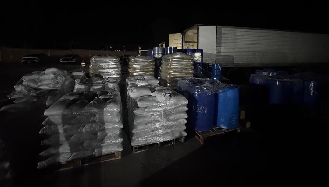 Omar García Harfuch, secretario de Seguridad y Protección Ciudadana (SSPC), dió a conocer el aseguramiento de más de 13 toneladas y 13 mil 400 litros de sustancias químicas, utilizados en la producción de drogas sintéticas, el hecho ocurrió en la carretera Panamericana Durango–Hidalgo del Parral, justo a la altura del kilómetro 238+700, tras una revisión a un tractocamión.
