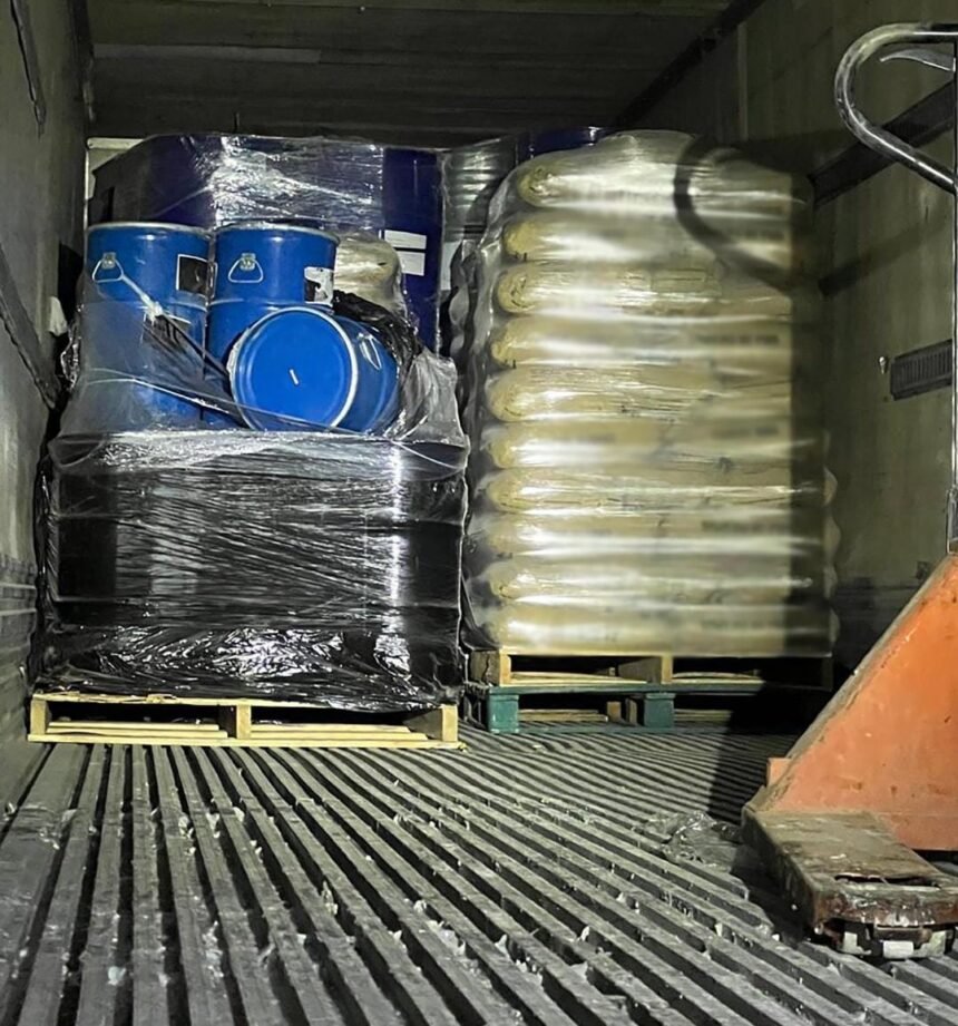 En total fueron asegurados 300 costales con siete mil 500 kilos de acetona de plomo, 36 costales de 900 kilos de ácido tartárico, 20 tambos con cuatro mil litros de etanol, 100 kilos de una sustancia sólida color blanco, cuatro mil 500 kilos de sosa y tres mil litros de químicos, entre otras sustancias liquidas.