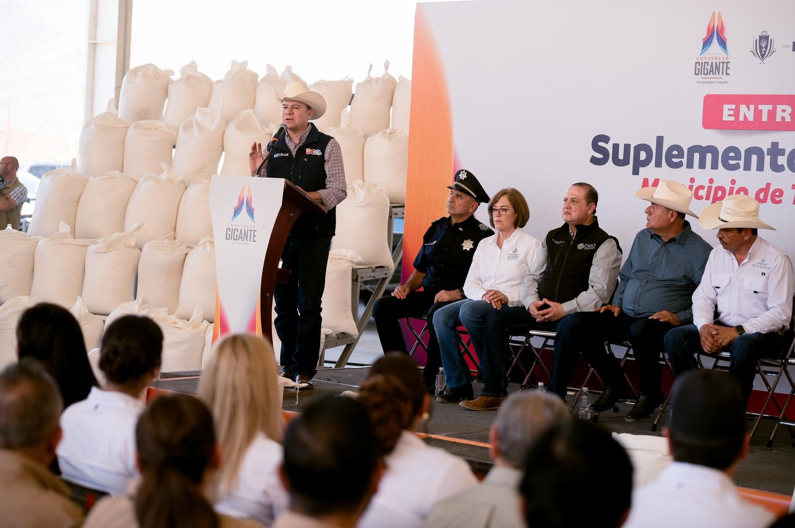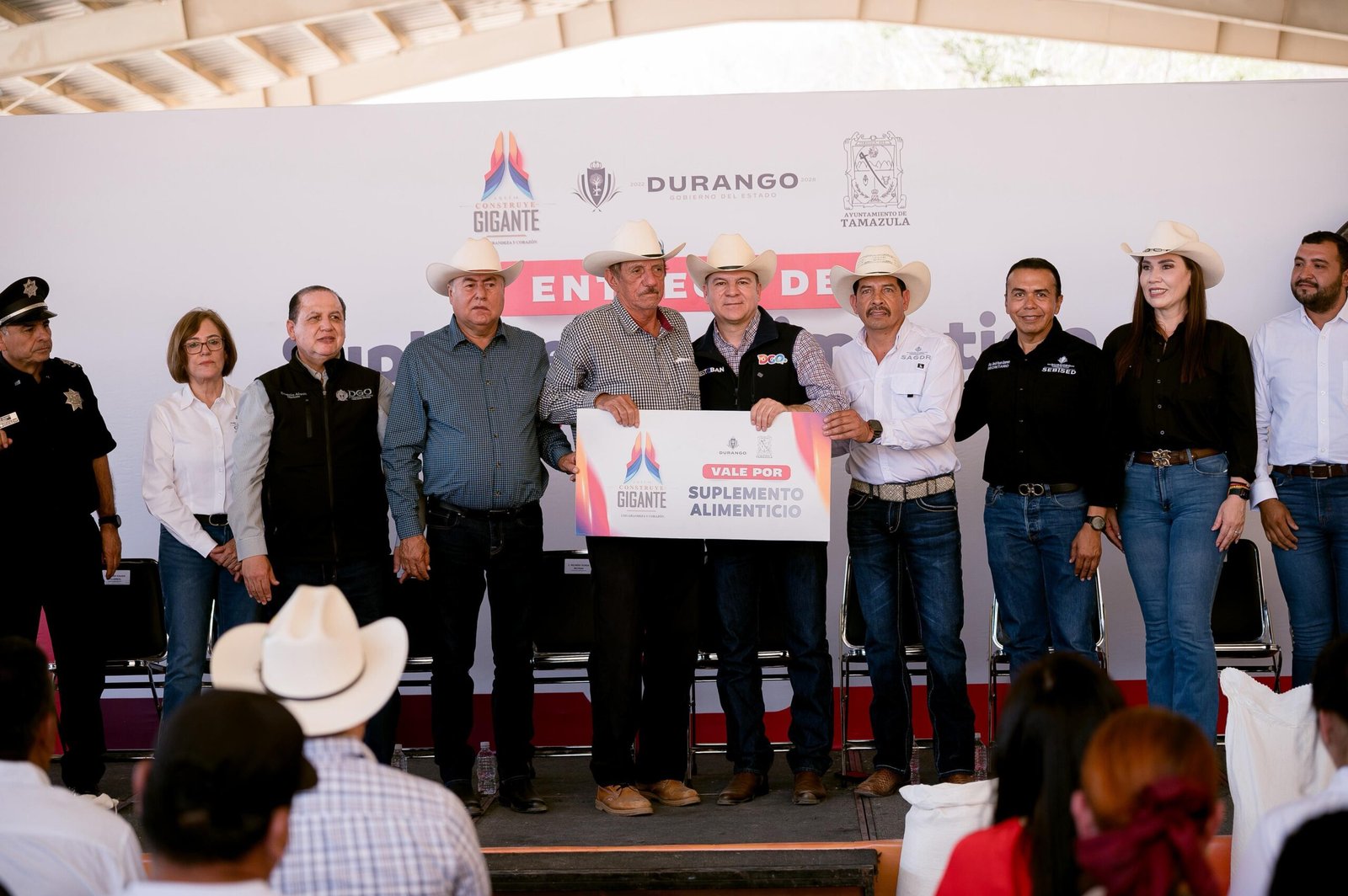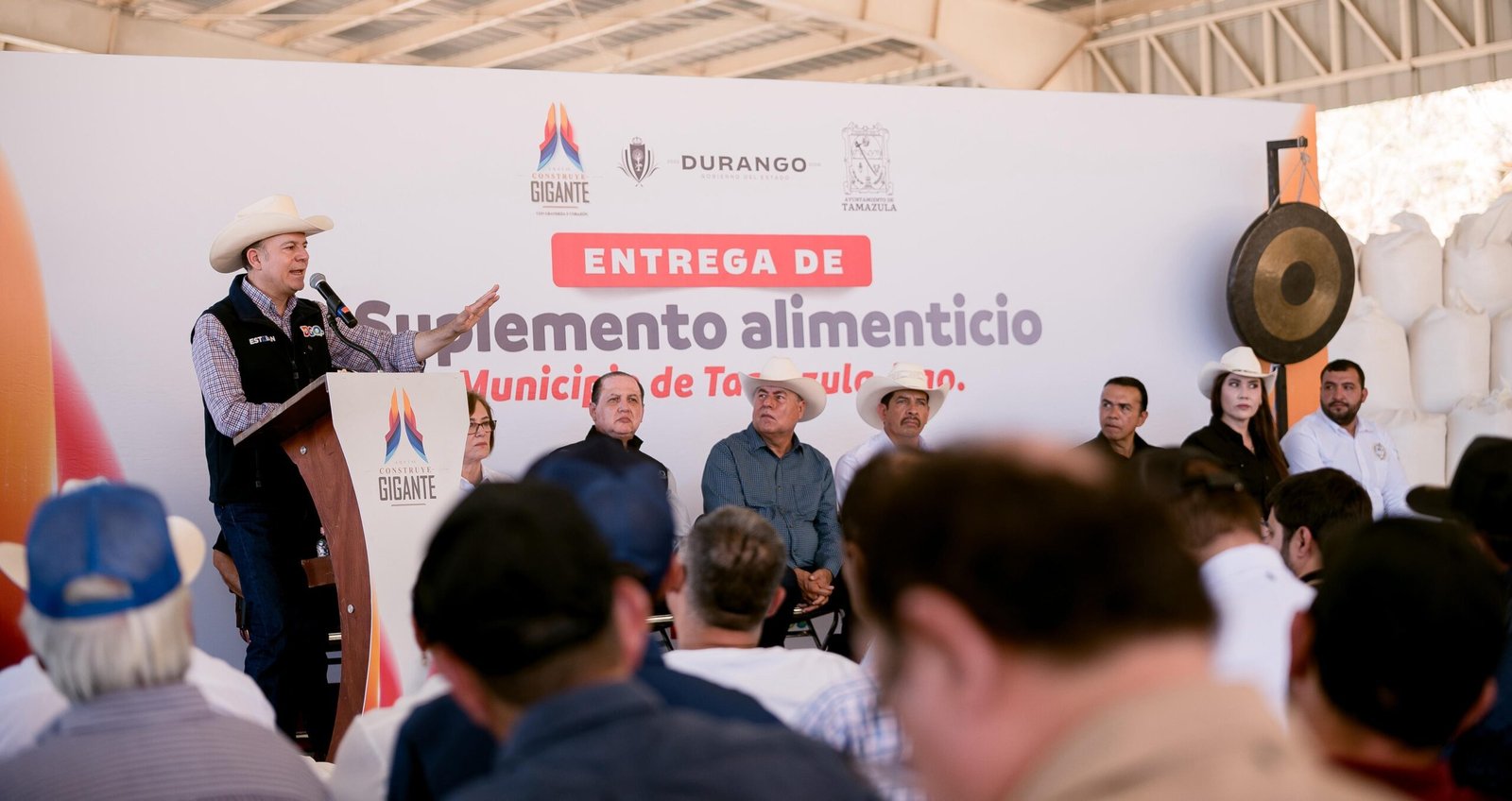 Tamazula, Dgo.– Con alimento de alta calidad para el ganado, que permitirá mantener la producción y enfrentar la temporada complicada, el gobernador del estado, Esteban Villegas Villarreal, encabezó en Tamazula la entrega de 30 toneladas de suplemento alimenticio, acompañado del presidente municipal, Ricardo Ochoa Beltrán, como parte de su gira de trabajo por los 39 municipios y en una acción dirigida a fortalecer la actividad ganadera en distintas regiones del municipio.