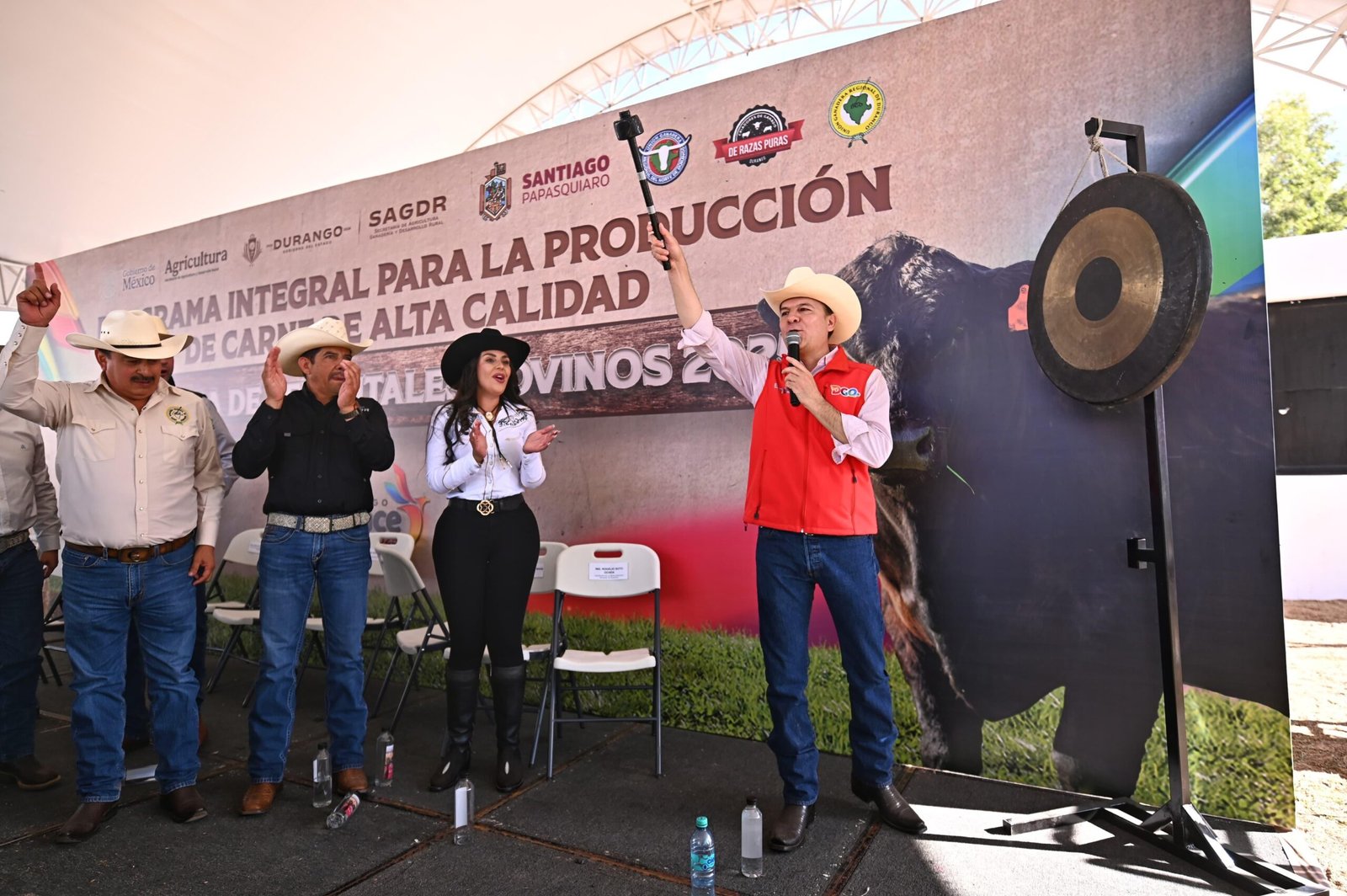 Santiago Papasquiaro, Dgo.– En Durango estamos trabajando para sacar adelante la ganadería y la agricultura de la entidad, señaló el gobernador Esteban Villegas Villarreal, acompañado por Arturo Macosay Córdova, coordinador general de Ganadería en SADER, durante la entrega de 162 sementales bovinos a productores de seis municipios, como parte del Programa Integral para la Producción de Carne de Alta Calidad, desarrollado en coordinación con el Gobierno Federal.En una primera etapa, este programa contempla la entrega de mil ejemplares en todo el estado.