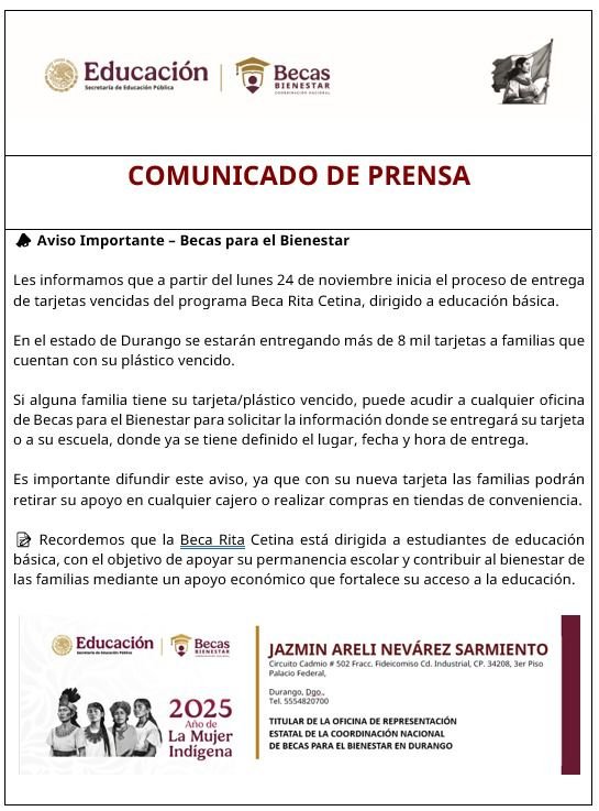 A partir del lunes 24 de noviembre iniciará el proceso de entrega para las tarjetas vencidas del programa Beca Rita Cetina, dirigido a educación básica.