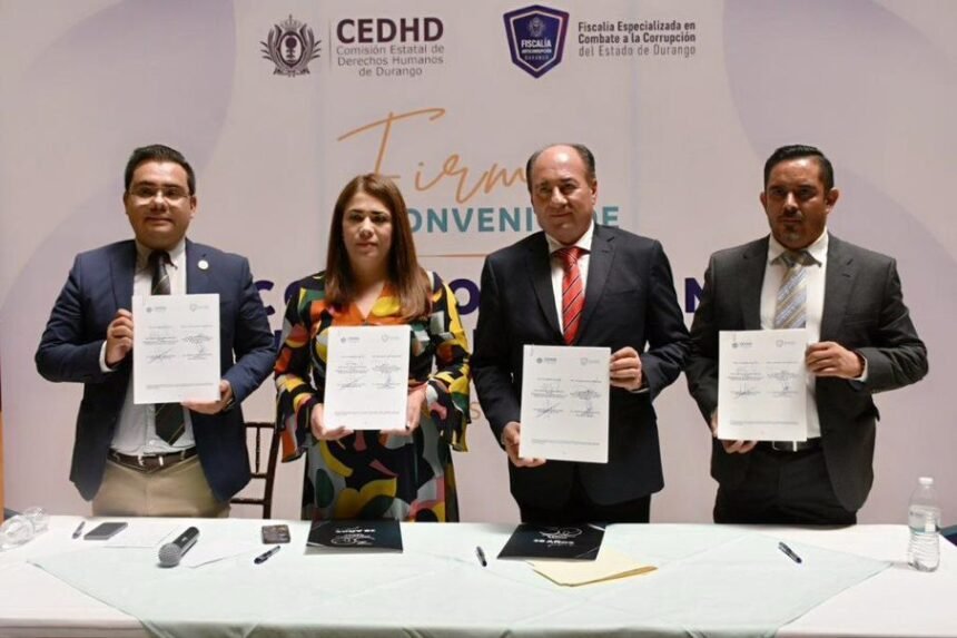 La Comisión Estatal de Derechos Humanos y la Fiscalía Especializada en Combate a la Corrupción, encabezadas por Karla Obregón Avelar y Noel Díaz Rodríguez, suscribieron un convenio de colaboración entre ambas instituciones, el cual tiene como primera motivación desarrollar acciones conjuntas en el estado de Durango para la promoción, protección y respeto del derecho humano a vivir en un ambiente libre de corrupción.
