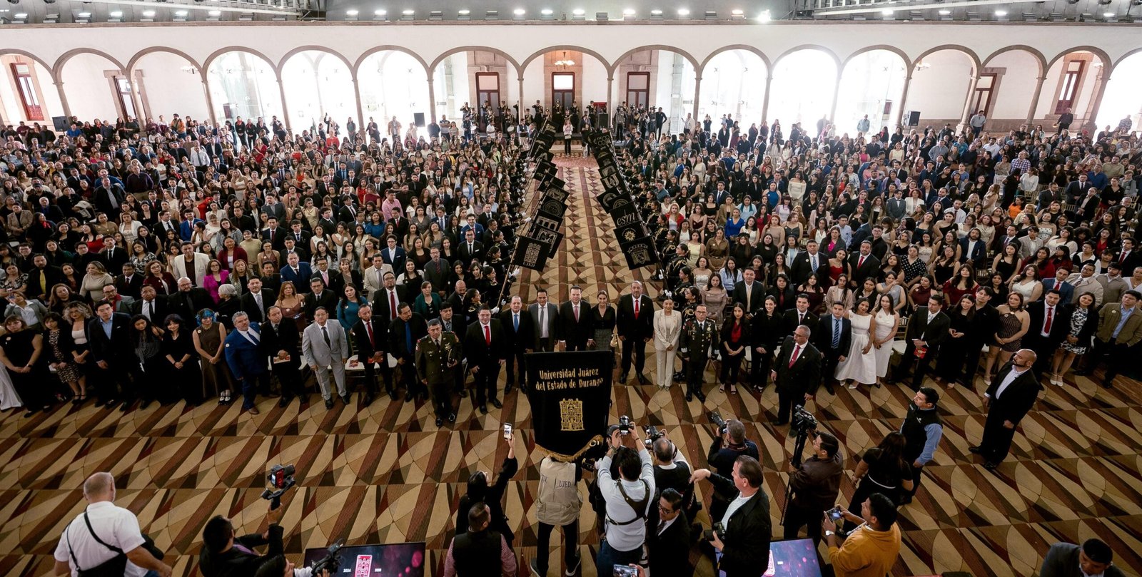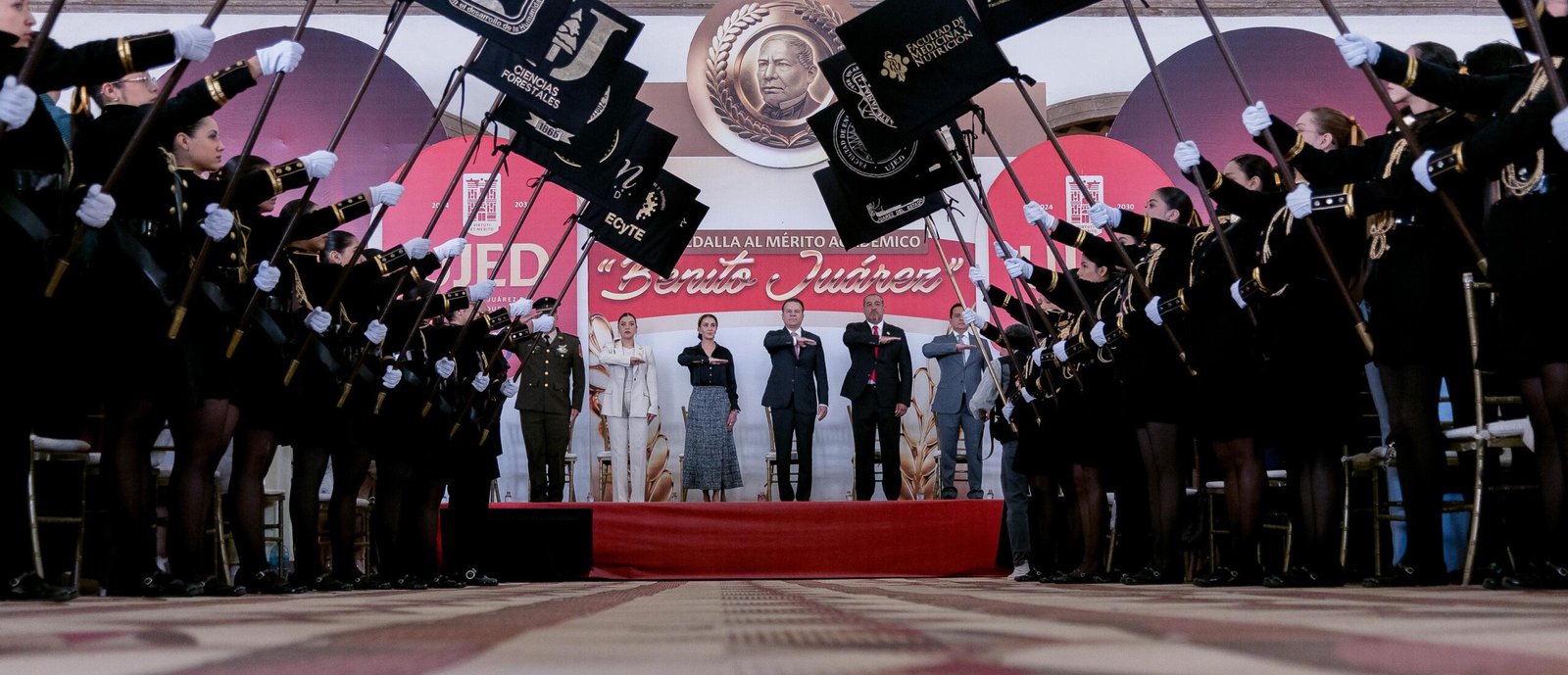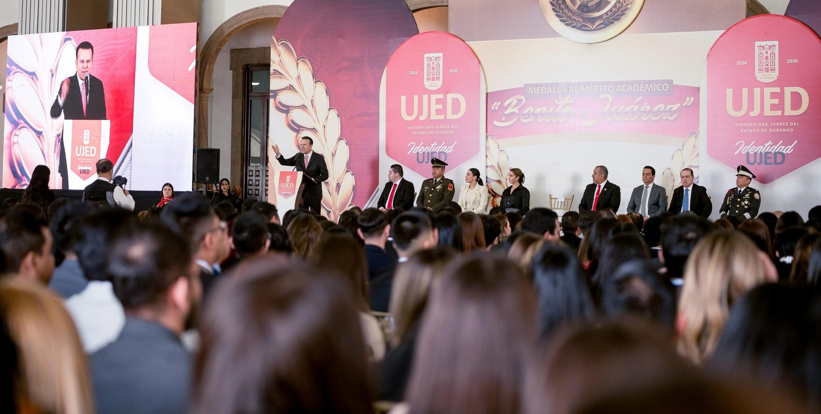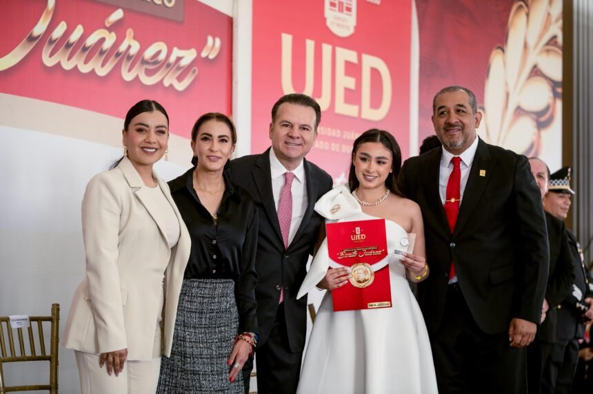 “Honor a quien honor merece; hoy son galardonados por su compromiso con la excelencia y por dar lo mejor de ustedes”, destacó el gobernador Esteban Villegas Villarreal durante la entrega de la Medalla al Mérito Académico “Benito Juárez”, donde, acompañado de su esposa, Marisol Rosso Rivera, y del rector de la Universidad Juárez del Estado de Durango (UJED), Ramón García Rivera, se reconoció a 654 egresados que obtuvieron un promedio superior a 9.2 durante su formación profesional.