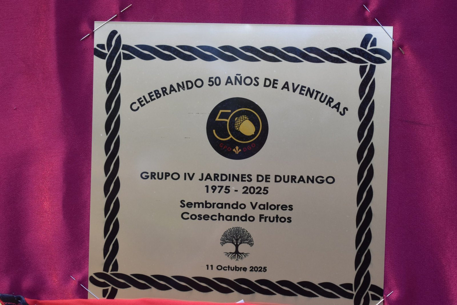 El Grupo IV de Scouts Jardines de Durango celebró su 50 aniversario con una emotiva ceremonia que incluyó la plantación de un árbol, la develación de una placa conmemorativa y una misa de acción de gracias en el templo de Santa Rosa de Lima. La celebración contó con la presencia de los padres de familia, quienes son parte fundamental en esta organización scout.