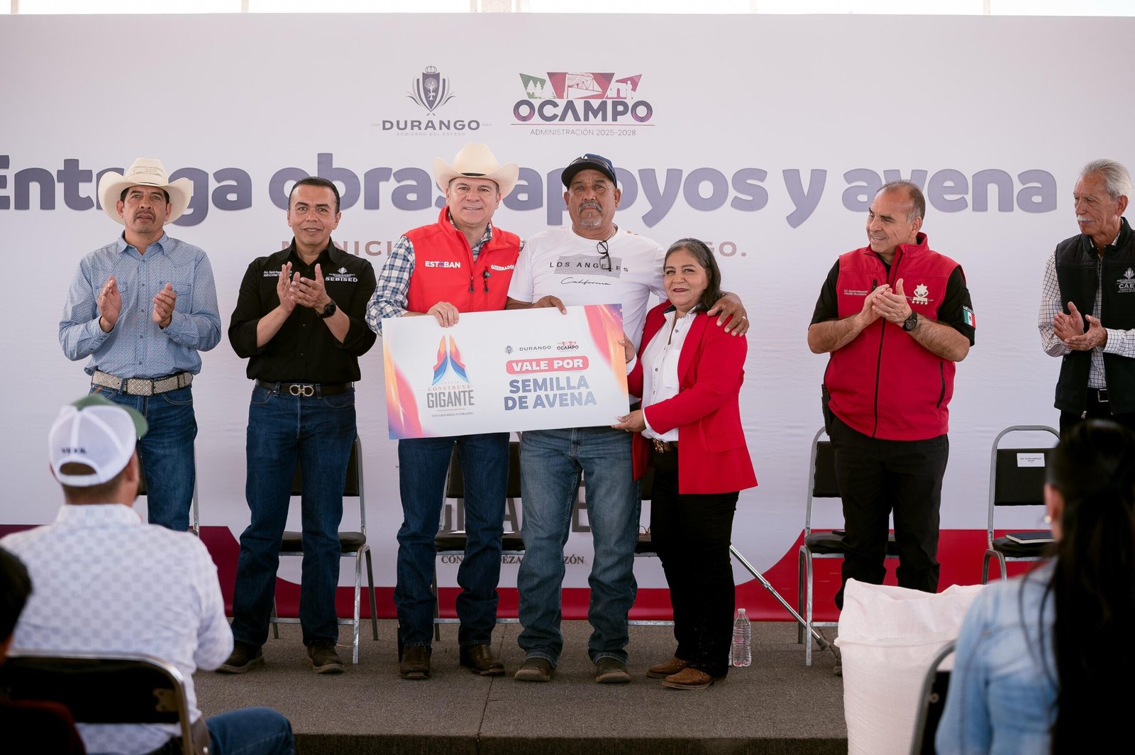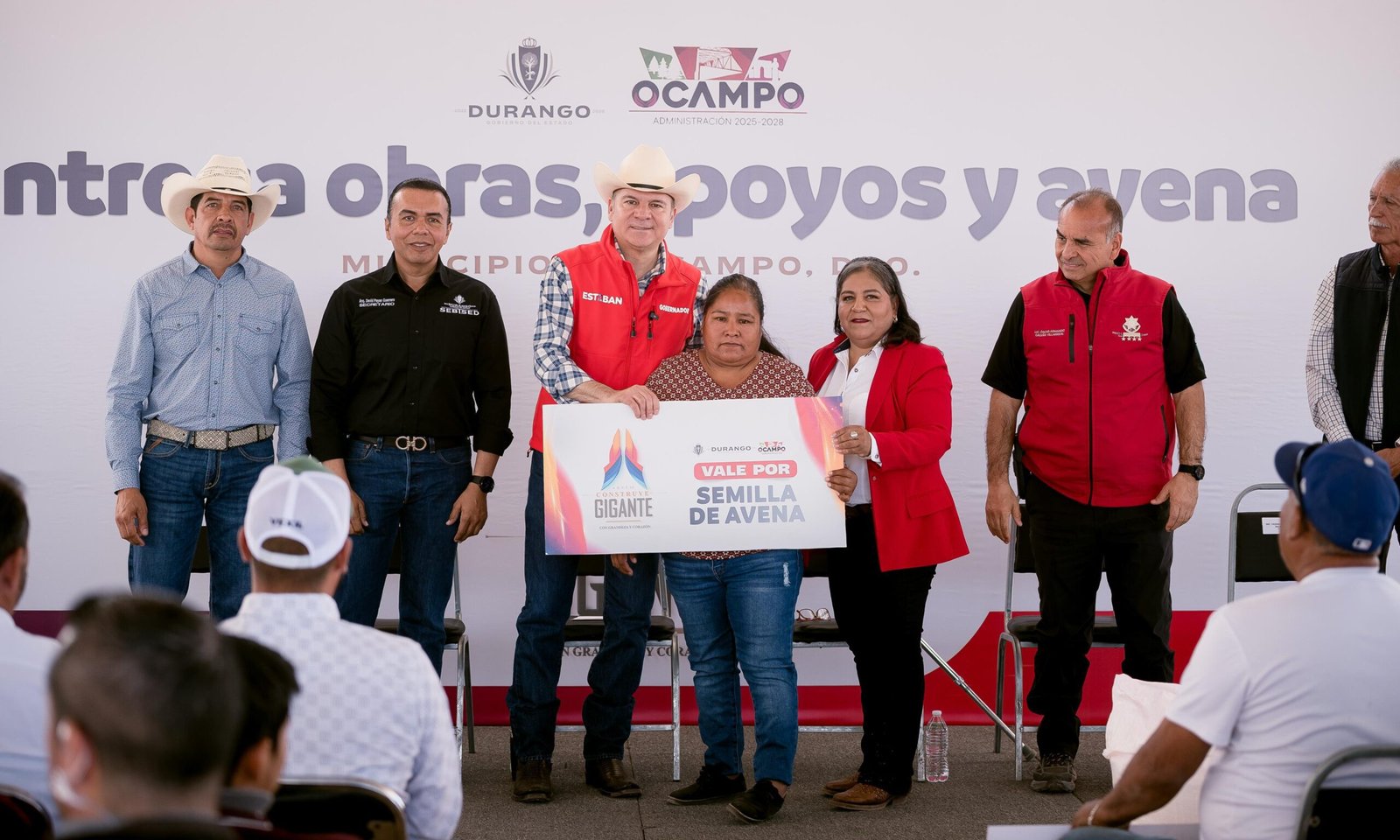 Ocampo, Dgo.— En gira de trabajo por Ocampo, el municipio más al norte del estado y frontera con Chihuahua, el gobernador Esteban Villegas Villarreal, acompañado por la presidenta municipal Teresa de Jesús Rosales Reyes, encabezó la entrega la Unidad Deportiva de Canutillo, 40 toneladas de semilla de avena para productores, equipamiento para seguridad pública, un nuevo pozo de agua y diversos apoyos sociales en beneficio de las familias del municipio.