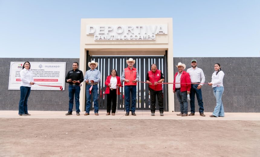 Ocampo, Dgo.— En gira de trabajo por Ocampo, el municipio más al norte del estado y frontera con Chihuahua, el gobernador Esteban Villegas Villarreal, acompañado por la presidenta municipal Teresa de Jesús Rosales Reyes, encabezó la entrega la Unidad Deportiva de Canutillo, 40 toneladas de semilla de avena para productores, equipamiento para seguridad pública, un nuevo pozo de agua y diversos apoyos sociales en beneficio de las familias del municipio.