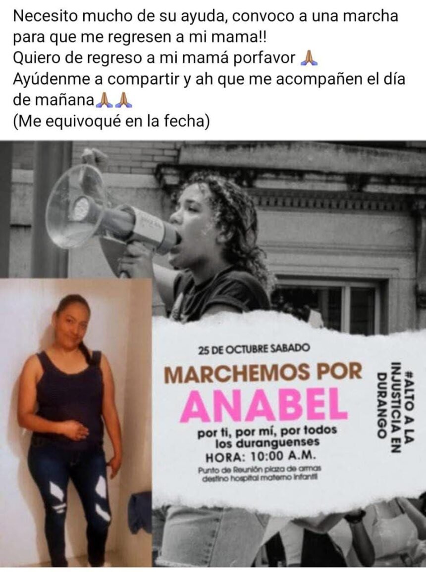 En una tercera publicación, la joven convocó a una marcha pacífica para exigir la liberación de su madre. El llamado es para este sábado a las 10:00 de la mañana, frente al Hospital Materno Infantil, en la ciudad de Durango.