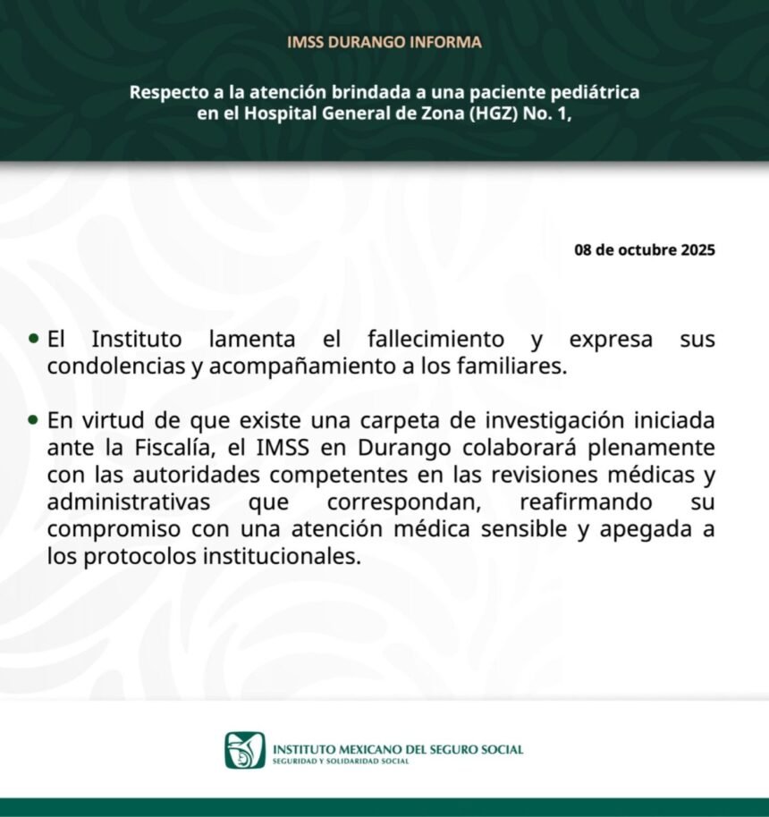 En virtud de que existe una carpeta de investigación iniciada ante la Fiscalía, el IMSS en Durango colaborará plenamente con las autoridades competentes en revisiones médicasy administrativas que correspondan, reafirmandos compromiso con una atención médica sensible y apegada a los protocolos institucionales”.