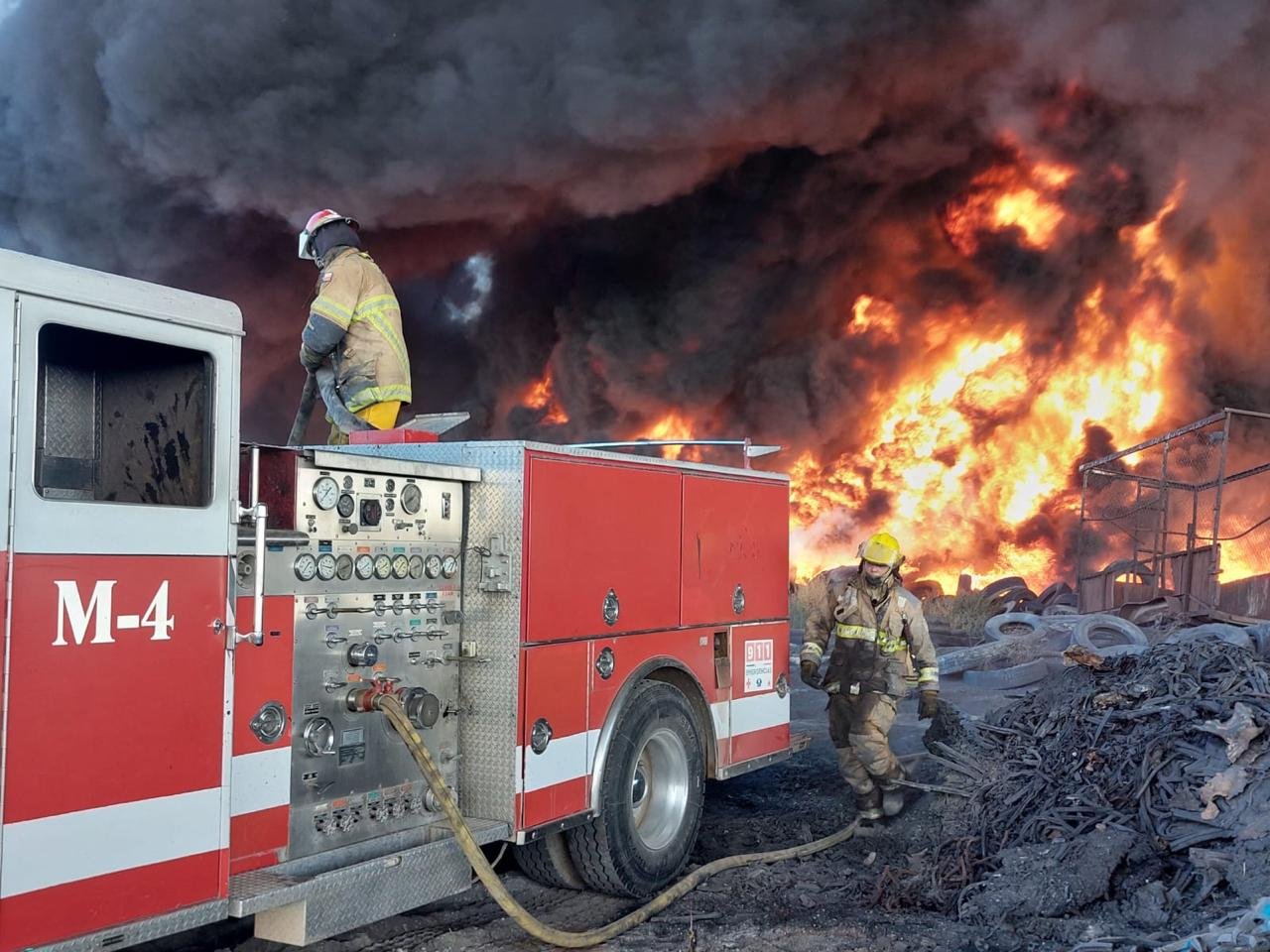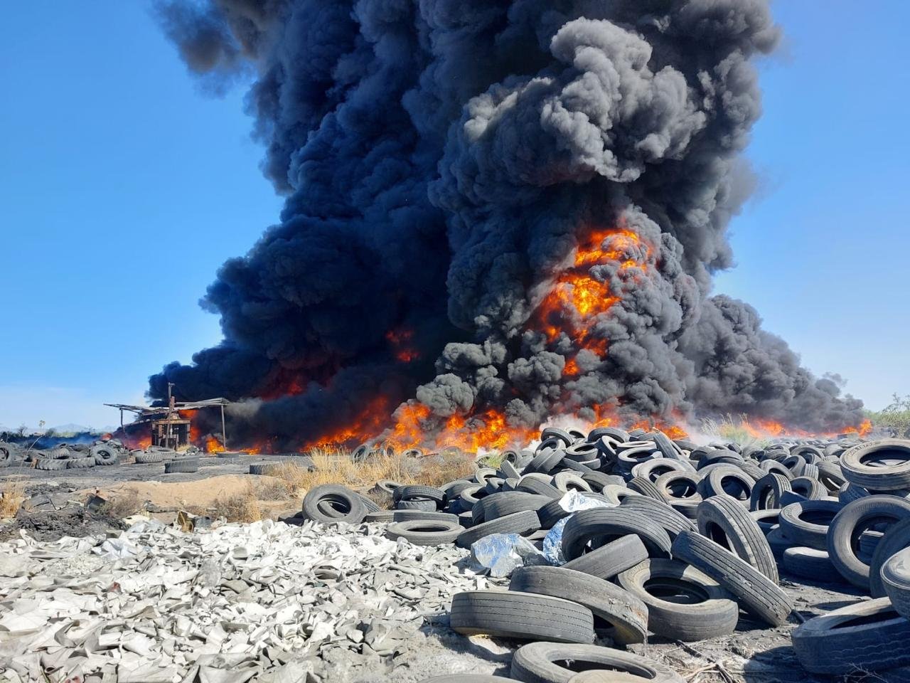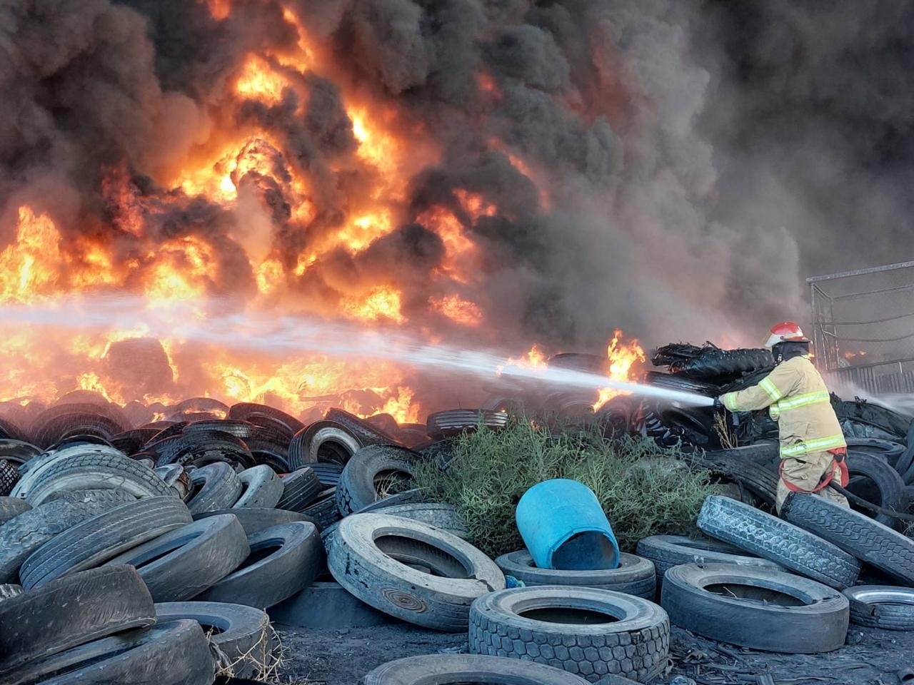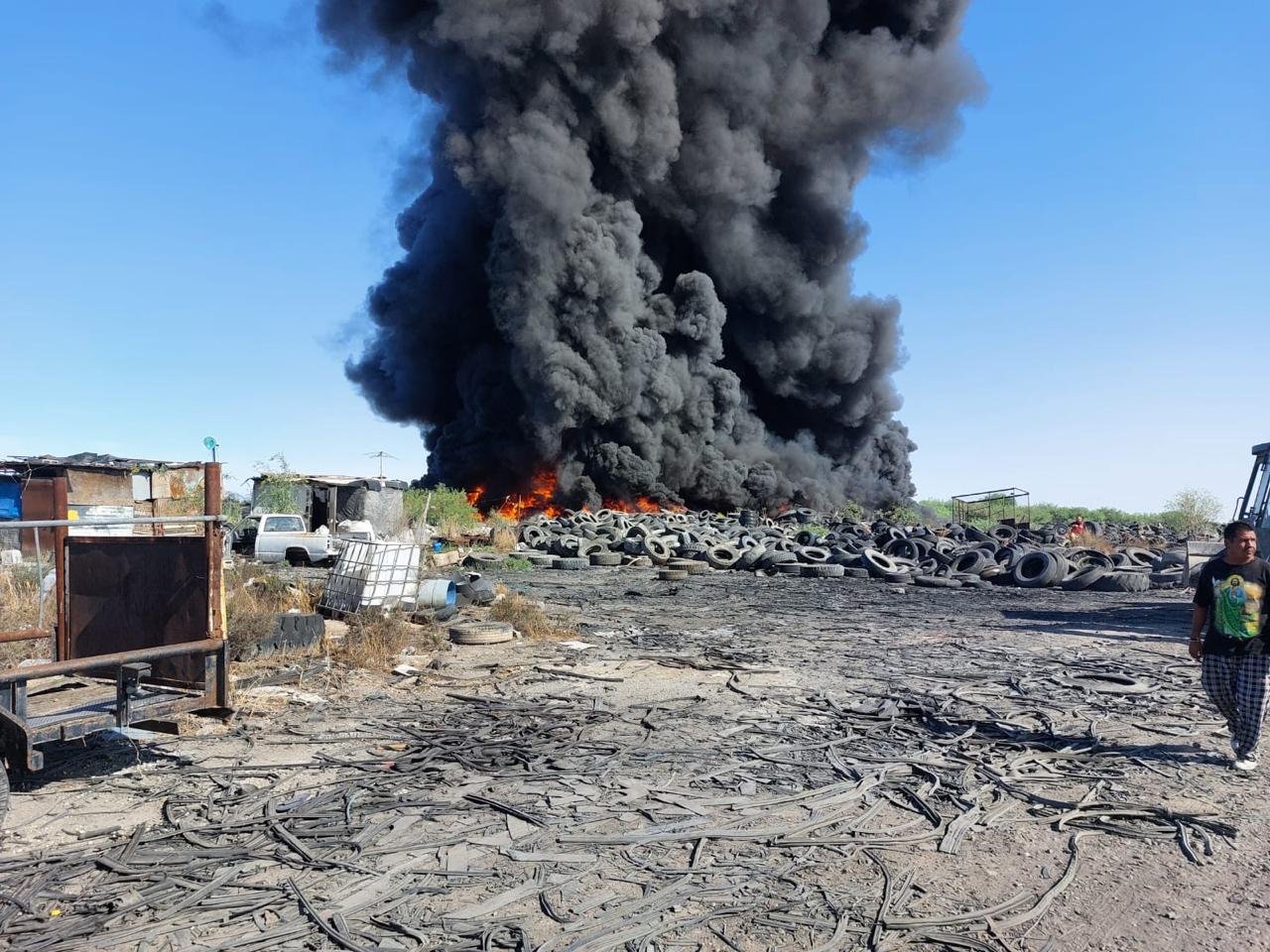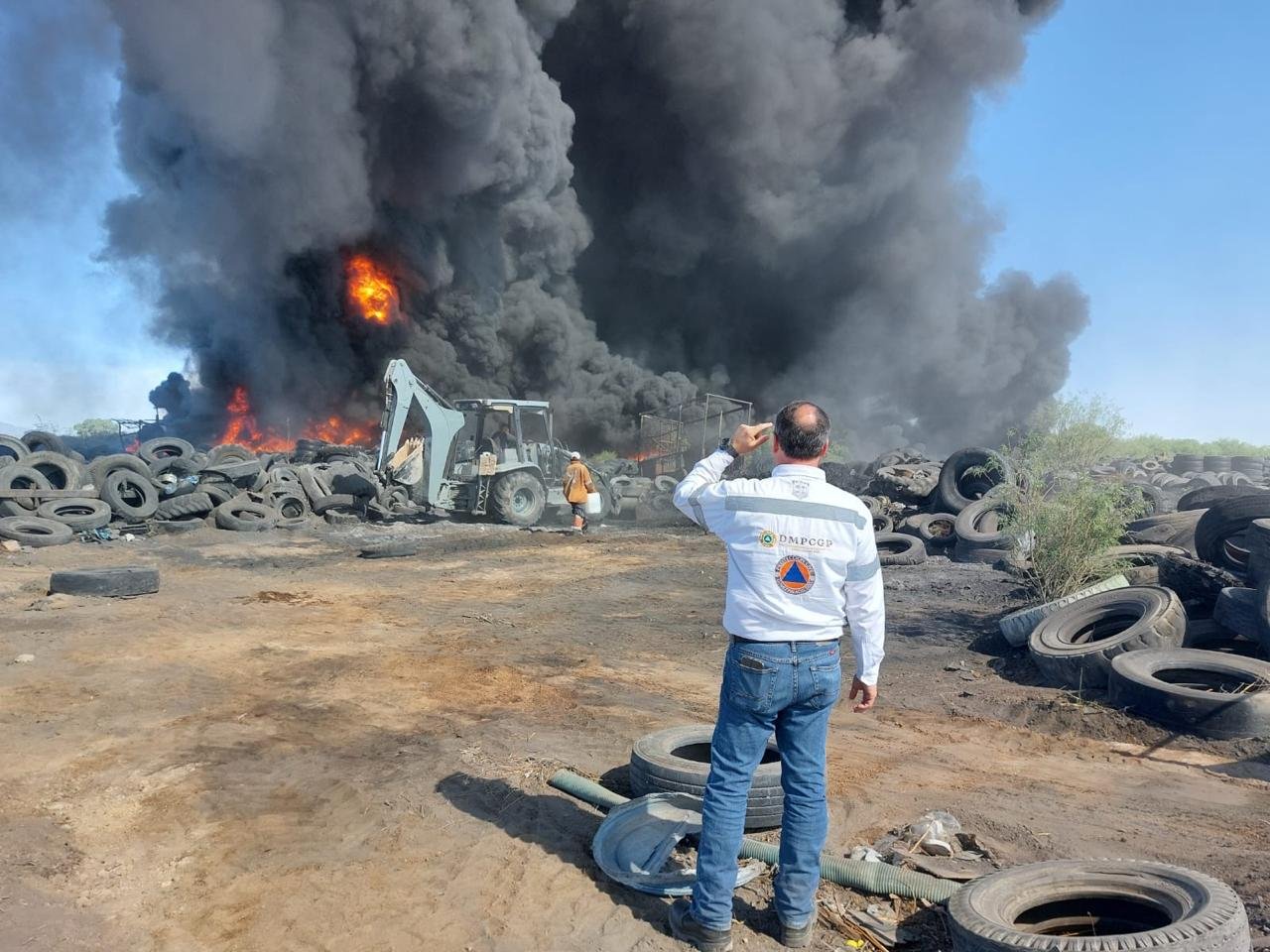 El funcionario explicó que el incendio ocurre en un terreno propiedad de una empresa dedicada a la recuperación de materiales derivados de llantas, por lo que el fuego se concentra en ese espacio.