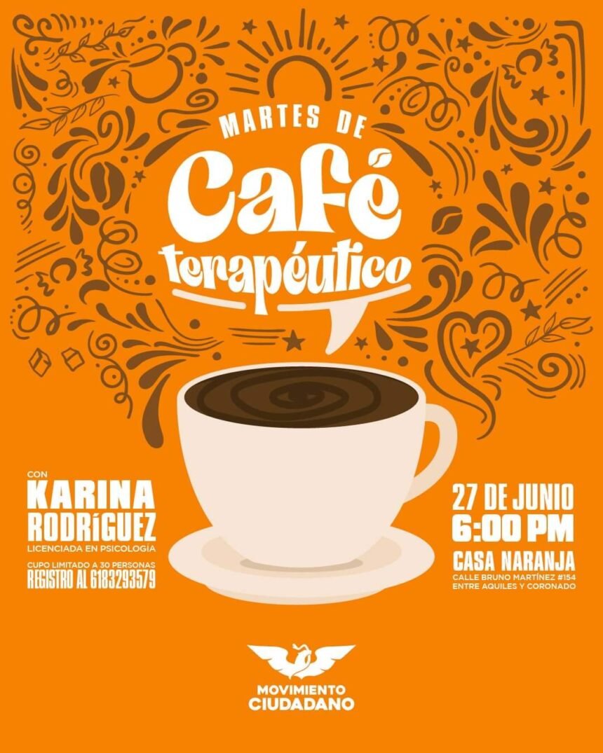 Movimiento Ciudadano preocupado y ocupado en llevar a cabo acciones preventivas a favor del cuidado de la salud mental de todas y todos los duranguenses, inicia con su primer “Café Terapéutico” este martes 27 de junio a las 18:00 horas en la Casa Ciudadana, ubicada en calle Bruno Martínez número 154, entre Aquiles Serdán y Coronado.