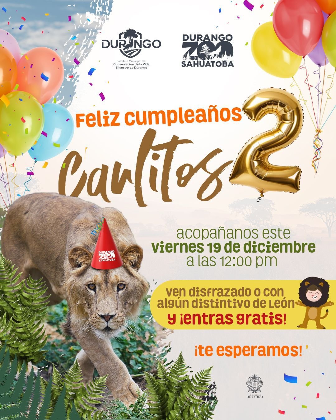 El Zoológico Sahuatoba se prepara para celebrar el cumpleaños número 2 de Carlitos, el leoncito que ha conquistado el corazón de los visitantes. El próximo 19 de diciembre, a partir de las 12 del mediodía, se llevará a cabo una fiesta especial para el felino, con actividades y regalos para los niños que asistan disfrazados de león.