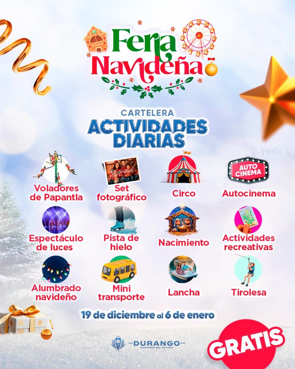 Niñas, niños, jóvenes y adultos podrán disfrutar de pista de hielo, espectáculos de luces, posadas tradicionales, un nacimiento monumental renovado, actividades recreativas y un Foro Cultural con talento duranguense, además de autocinema, juegos mecánicos y área gastronómica.