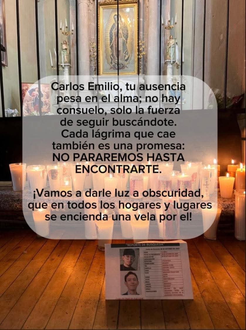 Hijo, Carlos Emilio, mamá, papá, toda tu familia, todo Durango oramos y esperamos tu regreso. Nuestra vida está en pausa, nuestros corazones laten con mucha fe y esperanza. Diosito es bueno y te traerá de regreso. Nos daremos abrazos que borren el dolor de tu ausencia, reiremos, bailaremos, platicaremos, cocinaremos, cantaremos. Cada día será más hermoso que el anterior. Nuestras vidas serán alegres de nuevo. Diosito, tráelo de regreso a casa, te lo ruego”.