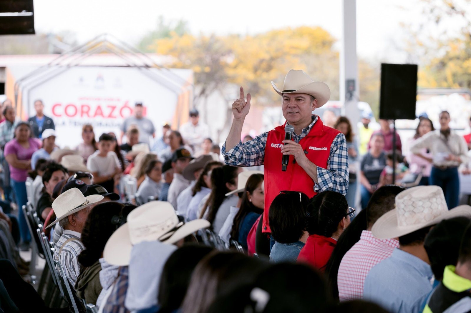 El gobernador Esteban Villegas Villarreal encabezó el encuentro realizado en la localidad de El Vetarrón, acompañado por la presidenta municipal Lorena Lucero Bustamante. Antes, el mandatario visitó los municipios de Hidalgo y Ocampo como parte de su recorrido por la región norte del estado.