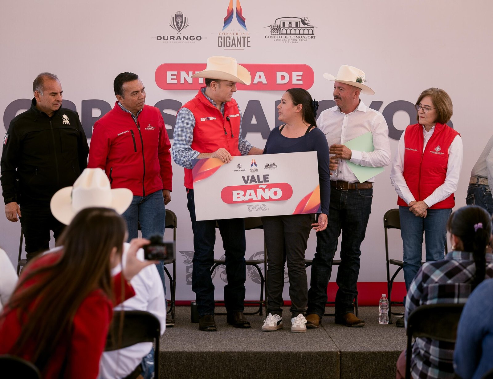 Coneto de Comonfort, Dgo. En gira de trabajo por este municipio Coneto de Comonfort, el gobernador Esteban Villegas Villarreal, junto al presidente municipal Jaime Soto Ochoa, encabezó la entrega de apoyos de mejoramiento de vivienda, acciones de agua potable y equipamiento de seguridad. Estas acciones incluyeron vales para la construcción de baños y pisos firmes, techos seguros, calentadores solares y tinacos, con el objetivo de mejorar las condiciones de vida y garantizar servicios básicos en los hogares.