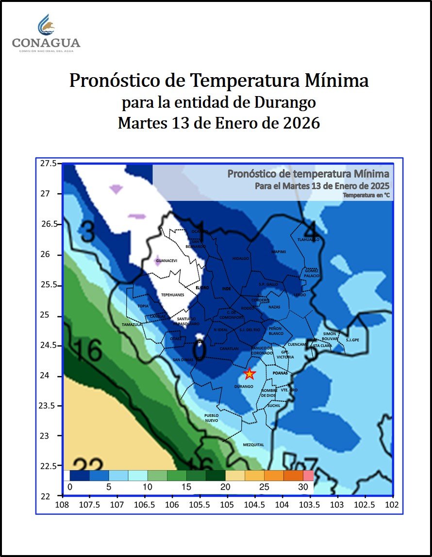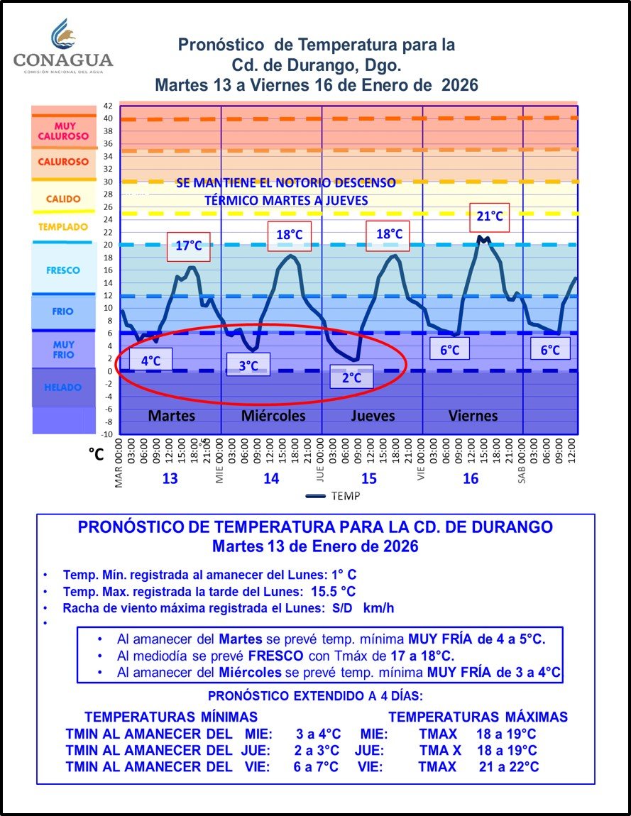La Conagua informó que, aunque el frente frío número 27 comenzará a debilitarse, la masa de aire polar asociada seguirá generando ambientes fríos a muy fríos durante la mañana y la noche en la Mesa del Norte, incluido Durango, además de bancos de niebla en algunas regiones.