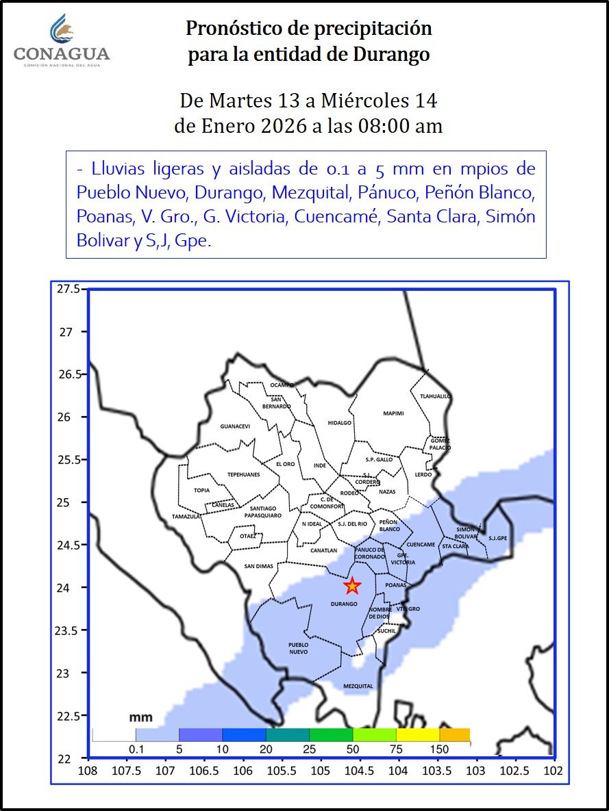 Además, existe probabilidad de lluvias ligeras y aisladas en municipios como Pueblo Nuevo, Durango, Mezquital, Pánuco, Peñón Blanco, Poanas, Vicente Guerrero, Guadalupe Victoria, Cuencamé, Santa Clara, Simón Bolívar y San Juan de Guadalupe.