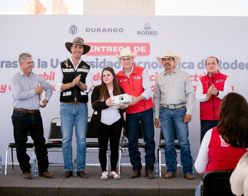 Rodeo, Dgo.– Como parte de su gira de trabajo por los 39 municipios del estado, el gobernador Esteban Villegas Villarreal, junto al presidente municipal Eduardo Estrada, entregó la rehabilitación de la subestación eléctrica, la construcción de corrales para ganado bovino y equipo de cómputo a la Universidad Tecnológica de Rodeo, acciones que fortalecen la formación de los estudiantes y generan beneficios directos para el sector productivo.