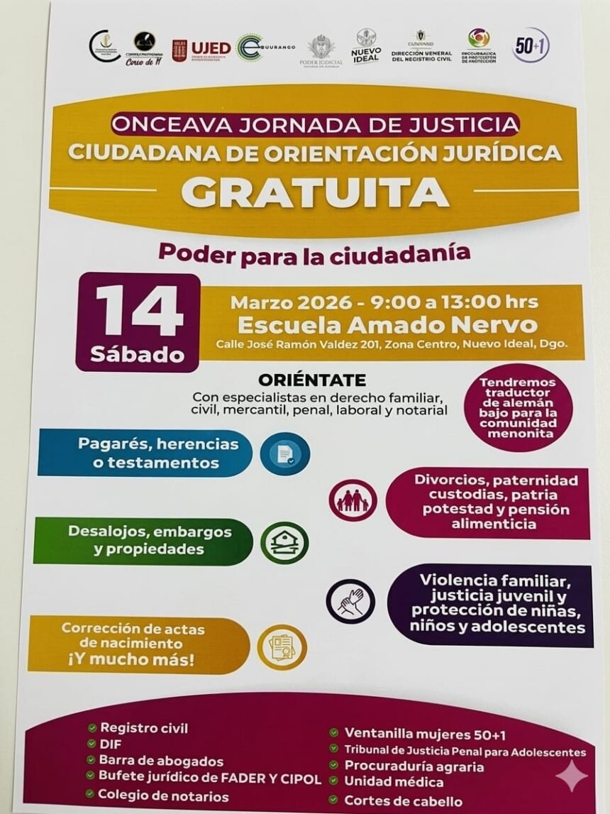Con el objetivo de acercar servicios legales y de orientación a la población, este sábado 14 de marzo se llevará a cabo la Onceava Jornada de Justicia Ciudadana de Orientación Jurídica Gratuita en el municipio de Nuevo Ideal.