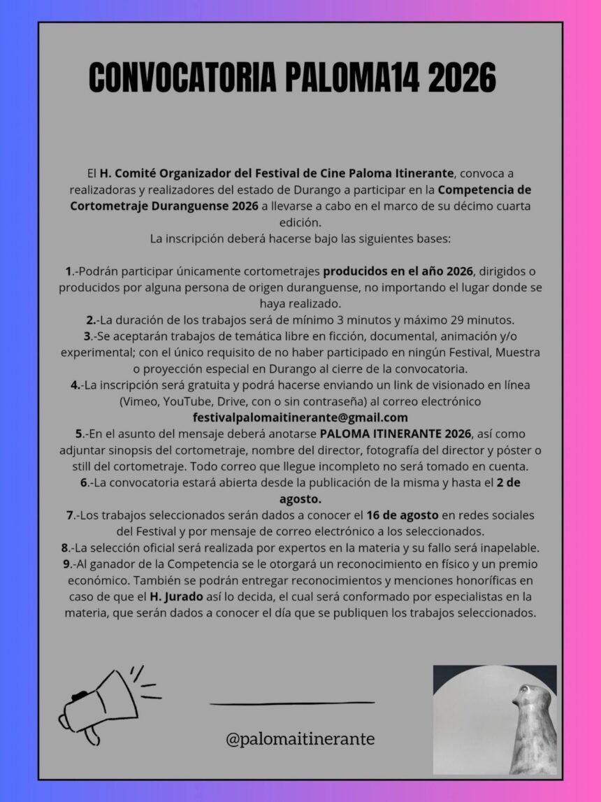 El H. Comité Organizador del Festival de Cine Paloma Itinerante ha lanzado una convocatoria para que realizadoras y realizadores del estado de Durango participen en la Competencia de Cortometraje Duranguense 2026.