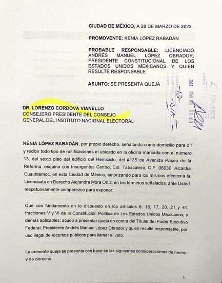 La senadora Kenia López Rabadán informó que presentó el día de hoy una queja ante el Instituto Nacional Electoral (INE) y una denuncia ante la Fiscalía Especializada para la Atención de los Delitos Electorales (FISEL) por las declaraciones emitidas por el presidente Andrés Manuel López Obrador, en las que realizó un llamado a votar por su movimiento y en contra de la oposición.