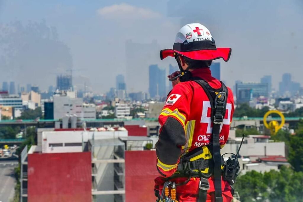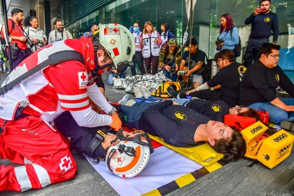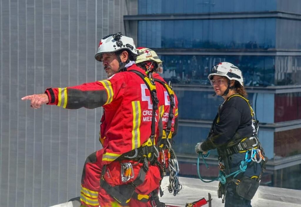 Con un escenario hipotético de un sismo de 7.2 con epicentro en Guerrero, se realizó un simulacro de evacuación y rescate vertical en un edificio de 10 pisos, en donde participaron 14 especialistas en rescate vertical y paramédicos con unidades de rescate y ambulancias.