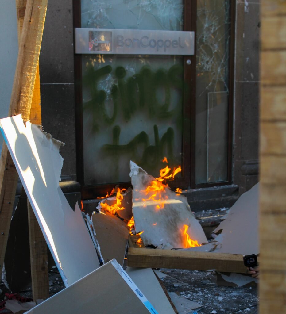 Según el reporte en la sucursal Coppel Constitución se quemaron algunas estructura de tablaroca y una puerta de madera mientras que en el edificio del Congreso hubo fuego al interior provocando la pronta movilización con una máquina de reacción inmediataz logrando sofocar el fuego habiendo durante el hecho, una policía lesionada con ligera intoxicación.