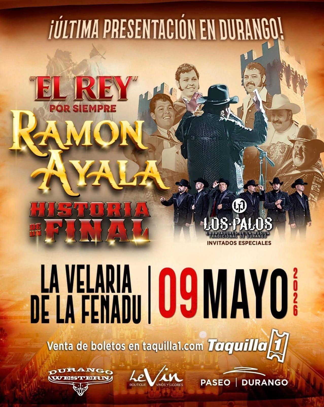 Ofrecerá su último concierto el sábado 9 de mayo a las 21:00 horas en la Velaria de la Feria Nacional Villista Durango alternando con el grupo Los Palos, los boletos ya están disponibles