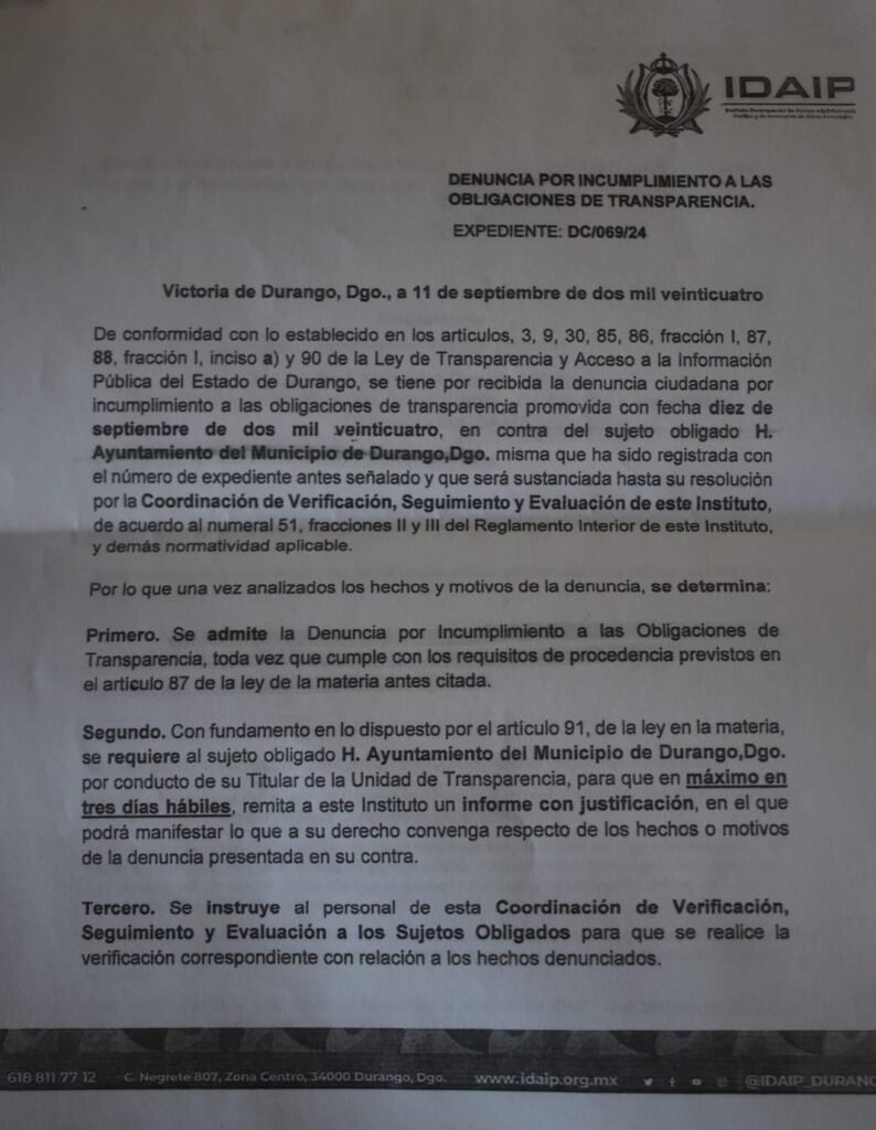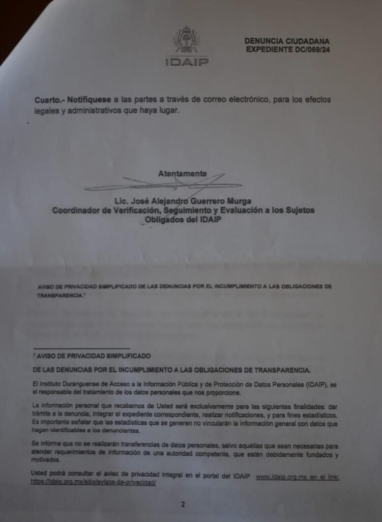 “Que me preguntan de este tema, porque ha tomado mucho revuelo, hoy les quiero compartir para que ya no quede ninguna duda y para que sepan quién miente este oficio, donde con color rosa le señalo dónde está la denuncia, ahí dice denunciada, en contra del sujeto obligado y la denuncia es por incumplimiento a las obligaciones en materia de transparencia, atentamente el IDAIP , que lastima que la comisionada presidenta del IDAIP, no sepa que su propio equipo es quien recibió esta denuncia, hoy les traigo copia de esta denuncia a ustedes mismos para que sepan que yo juego con éstos temas y es lamentable que los buenos oficios y la fe que le tenemos a la tranparencia en México, hoy viva un futuro incierto a causa de este tipo de personajes de esta parejita de funcionarios del director municipal de transparencia y por supuesto a la comisionada presidenta de IDAIP, porque el espíritu está institución precisamente es la transparencia y no estar defendiendo a nuestro director faldillon del municipio de Durango, que se escuda en las palabras de una mujer de la comisionada presidenta”, indicó el regidor.