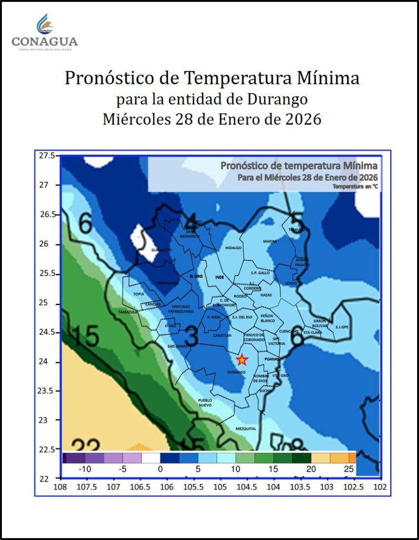 La Comisión Nacional del Agua (CONAGUA) informó que en los próximos días se mantendrá un ambiente frío a muy frío en Durango, debido a la influencia de masas de aire frío y al ingreso de un nuevo frente frío, el número 32, que impactará principalmente entre jueves y sábado.